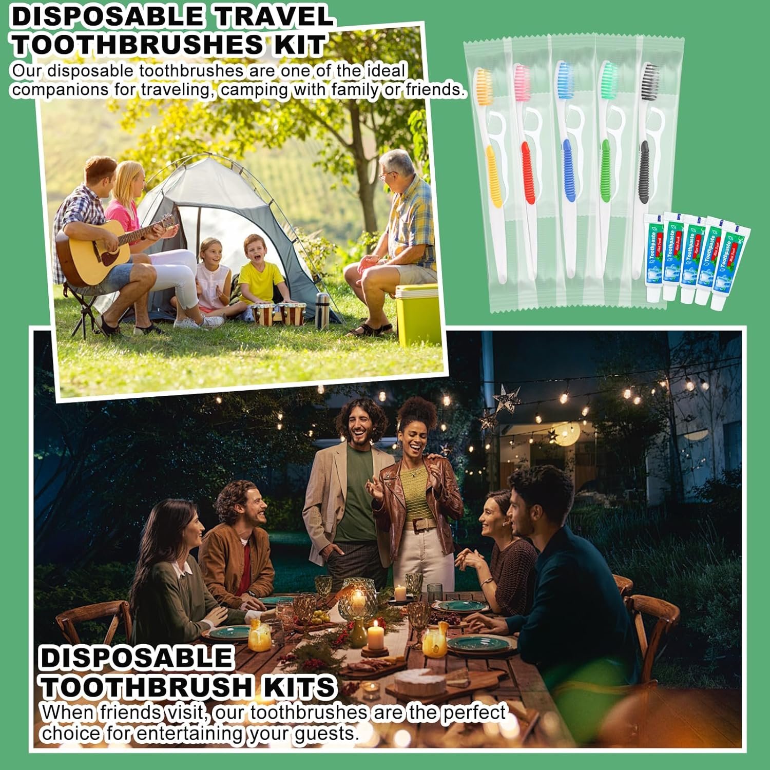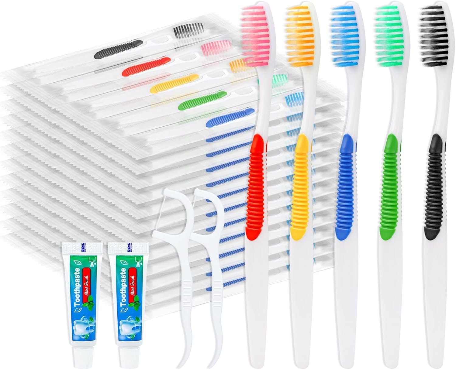 SUFFICIENT QUANTITY:30 Count toothbrush travel set,a total of 5 colors, each color 6 pieces. Includes 30 set x Toothbrush with Dental Floss Picks,30x5g Toothpaste. Enough quantity to meet the daily replacement needs of yourself and the whole family and the needs of guests