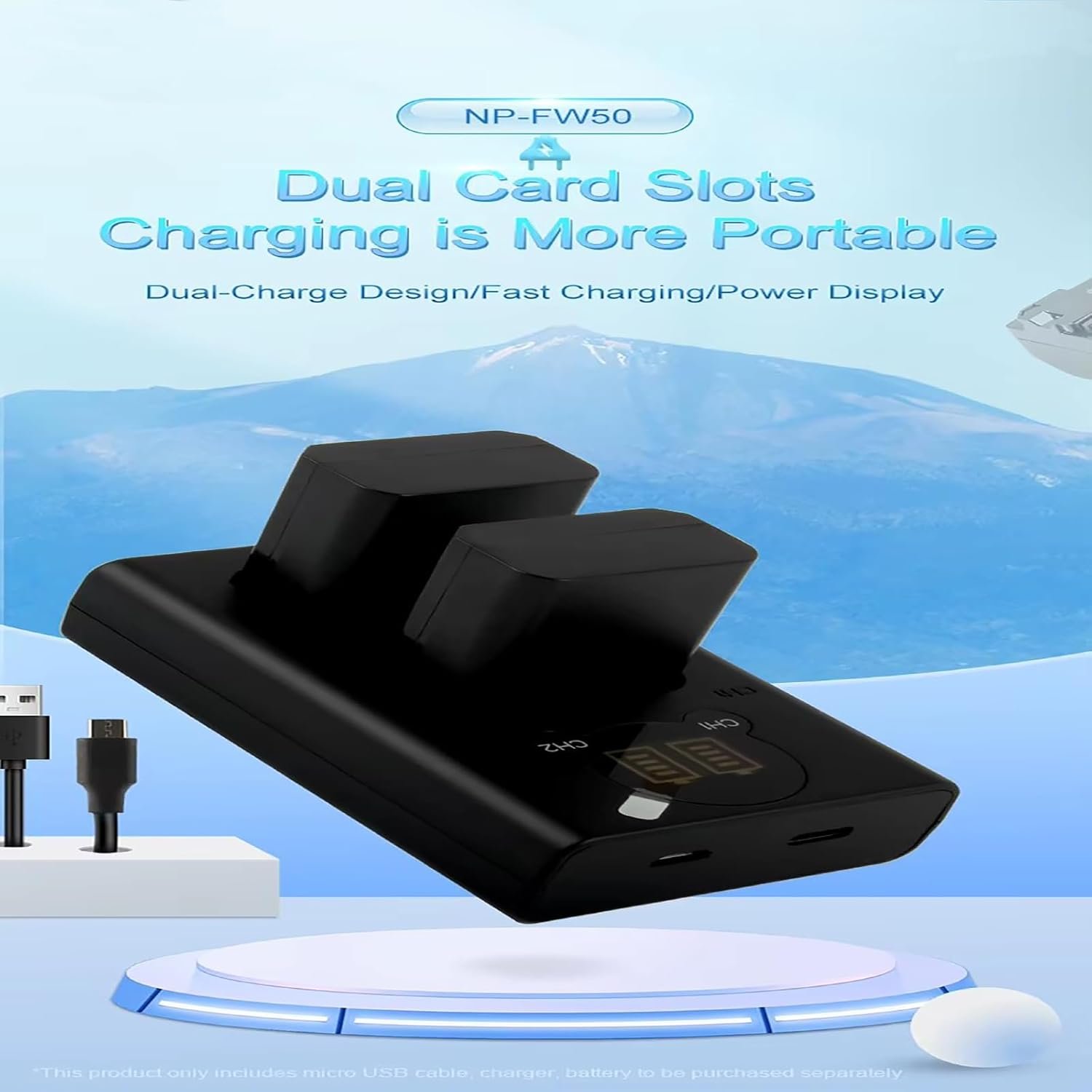 DL-FW50 Fast Dual Charger Quick Charge Portable Power Bank for A5100/A6100/A7s2/ZV-E10, NP-FW50/FZ100/FM500H Battery LCD Display
