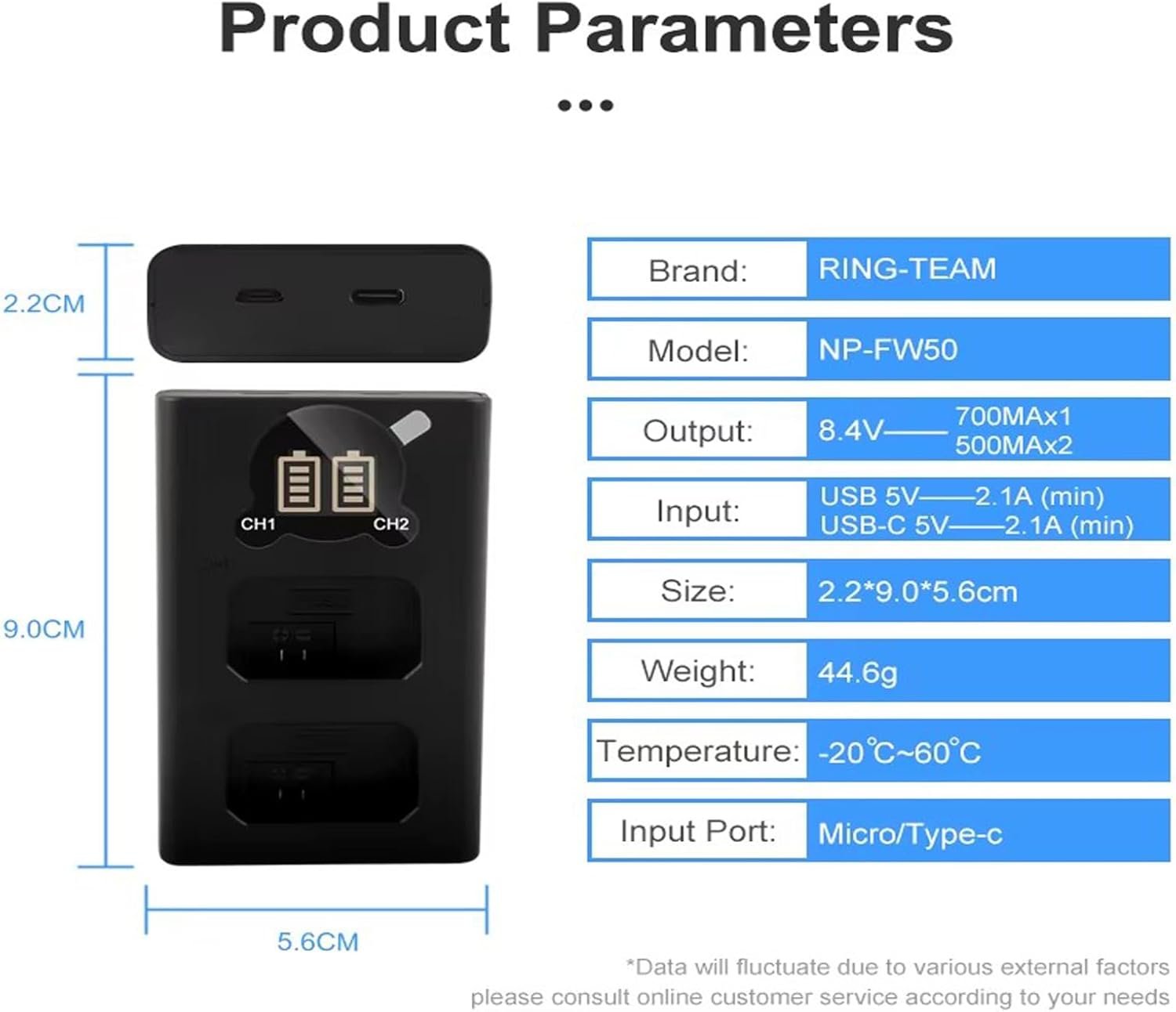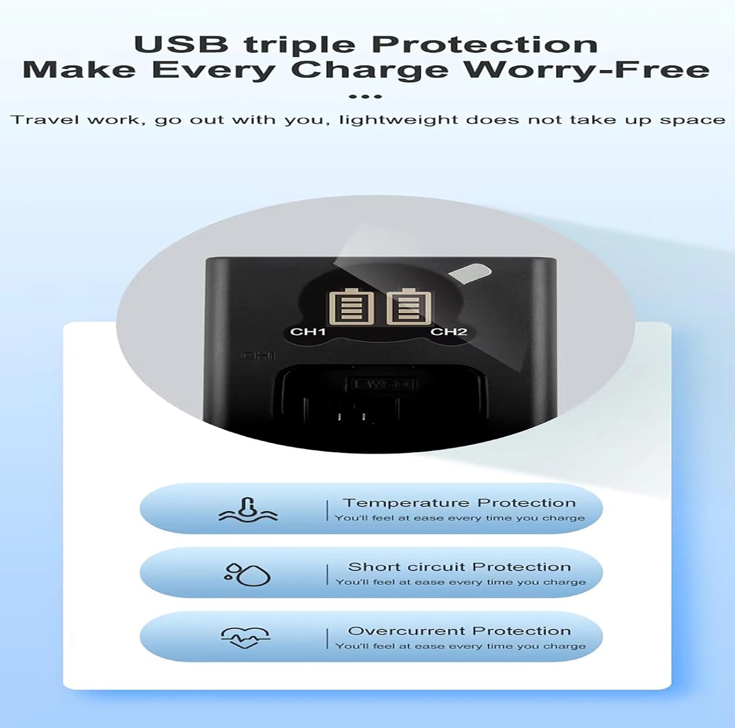 【Double Slot Efficient Charging】DL-FW50 adopts double slot independent charging design, which can charge two NP-FW50 batteries at the same time, improve charging efficiency and meet the needs of high-intensity shooting. Dual-slot independent circuitry ensures that each battery is charged without interfering with each other, avoiding the problem of uneven power distribution.