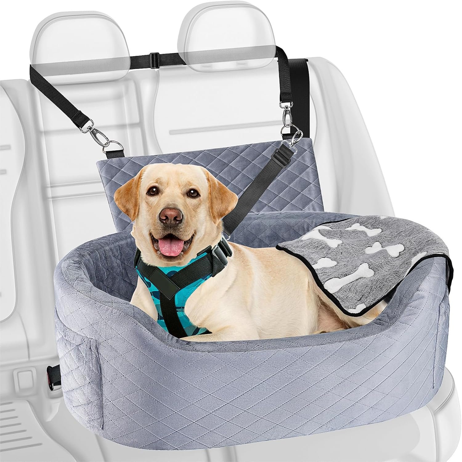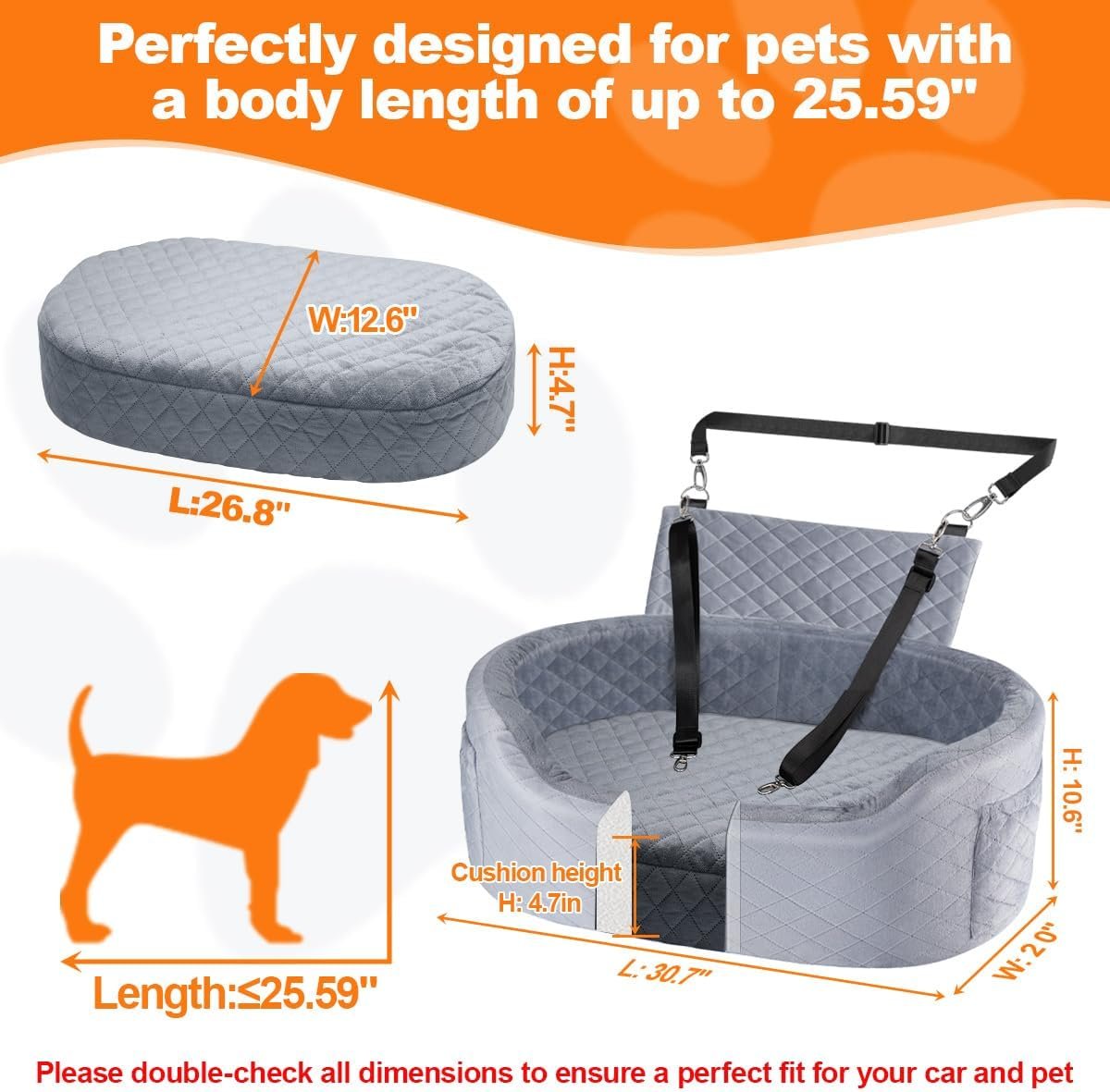 Dog Car Seat for Medium Large Dogs Up to 25.59″, 28D High-Density Memory Foam with Waterproof Cover, Pet Travel Bed with Storage Pockets, Blanket, Dog Safety Belt, Grey