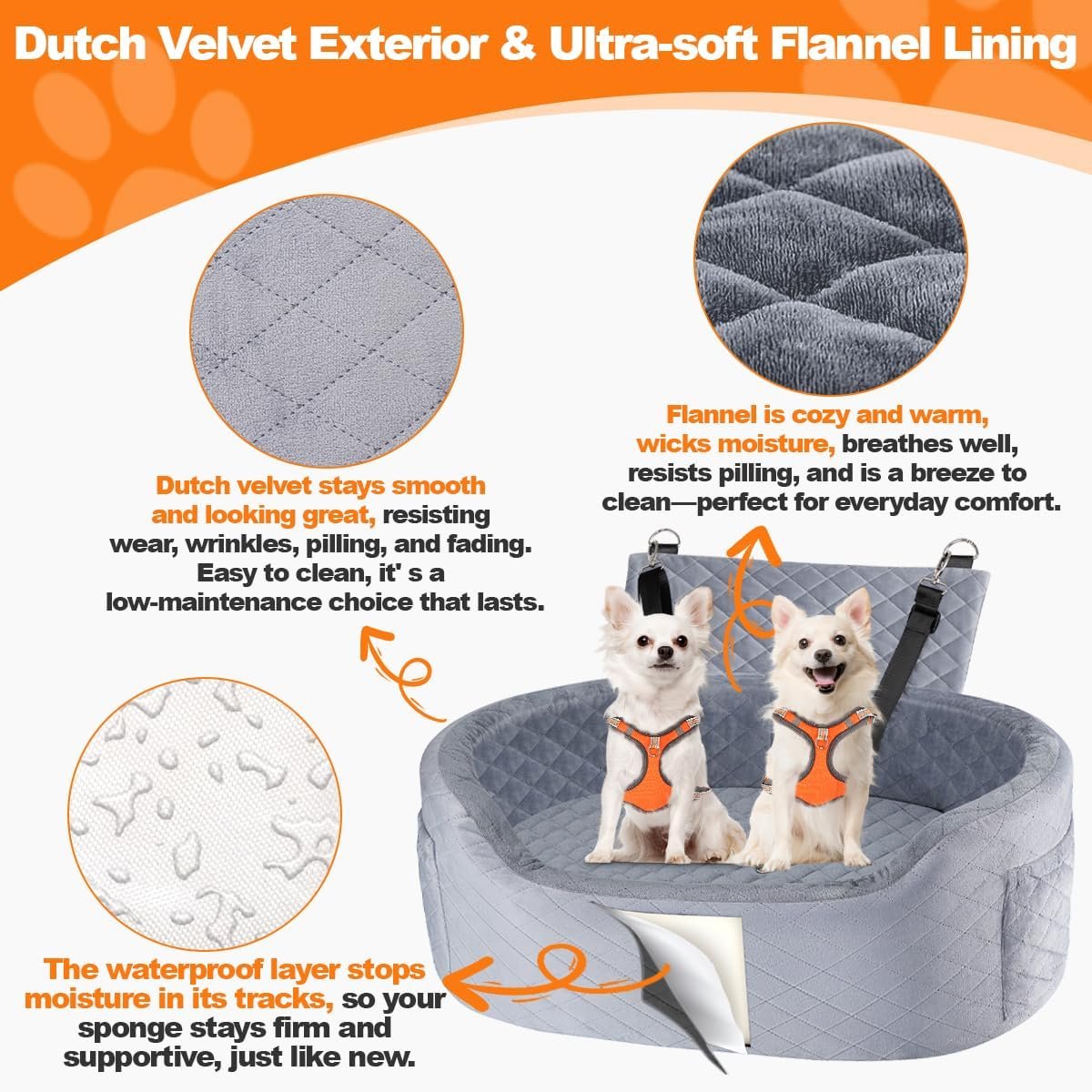 Premium Dutch Velvet Exterior & Soft and Cozy Flannel Interior: Crafted with luxe Dutch velvet, the outer layer feels smooth, resists wear, wrinkles, and fading, keeping it stylish and durable. The flannel lining in contact with your pet is ultra-soft and moisture-wicking, ensuring your pet stays cozy, dry, and comfortable on every ride