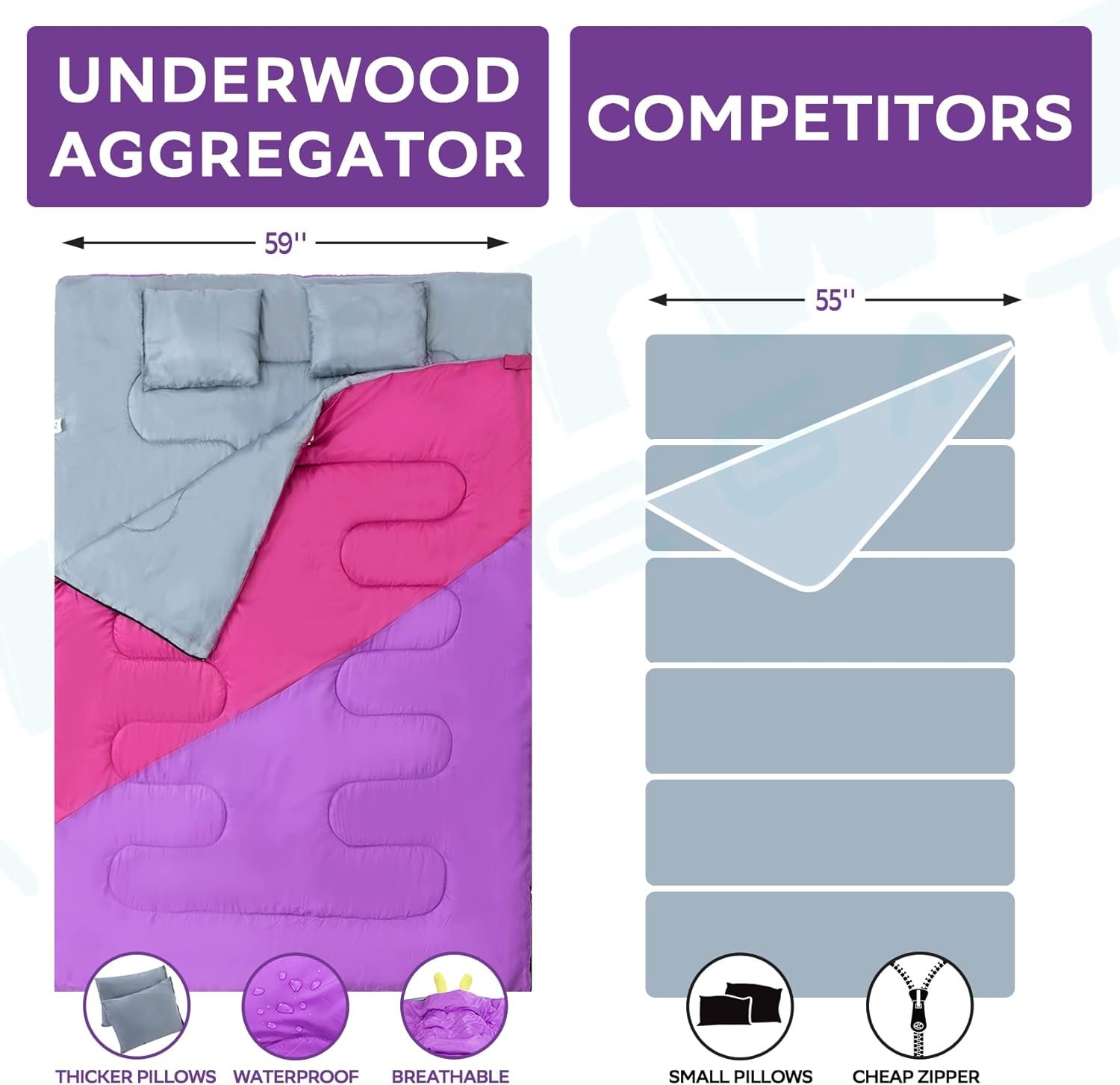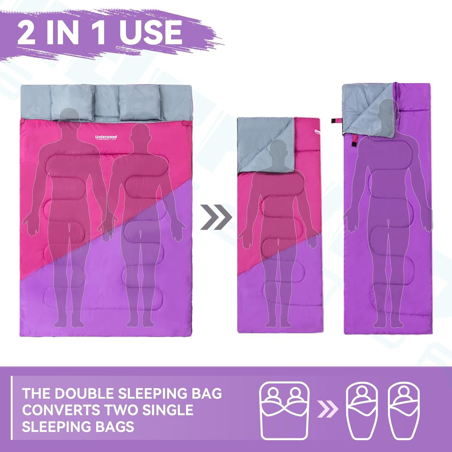 Double Sleeping Bag for Adults Kids – Lightweight 2 Person Sleeping Bag with Pillow, Queen Size Waterproof Camping Sack Two Person for Girls, Boys, Youths, Teens, Compact for Cold Weather & Warm