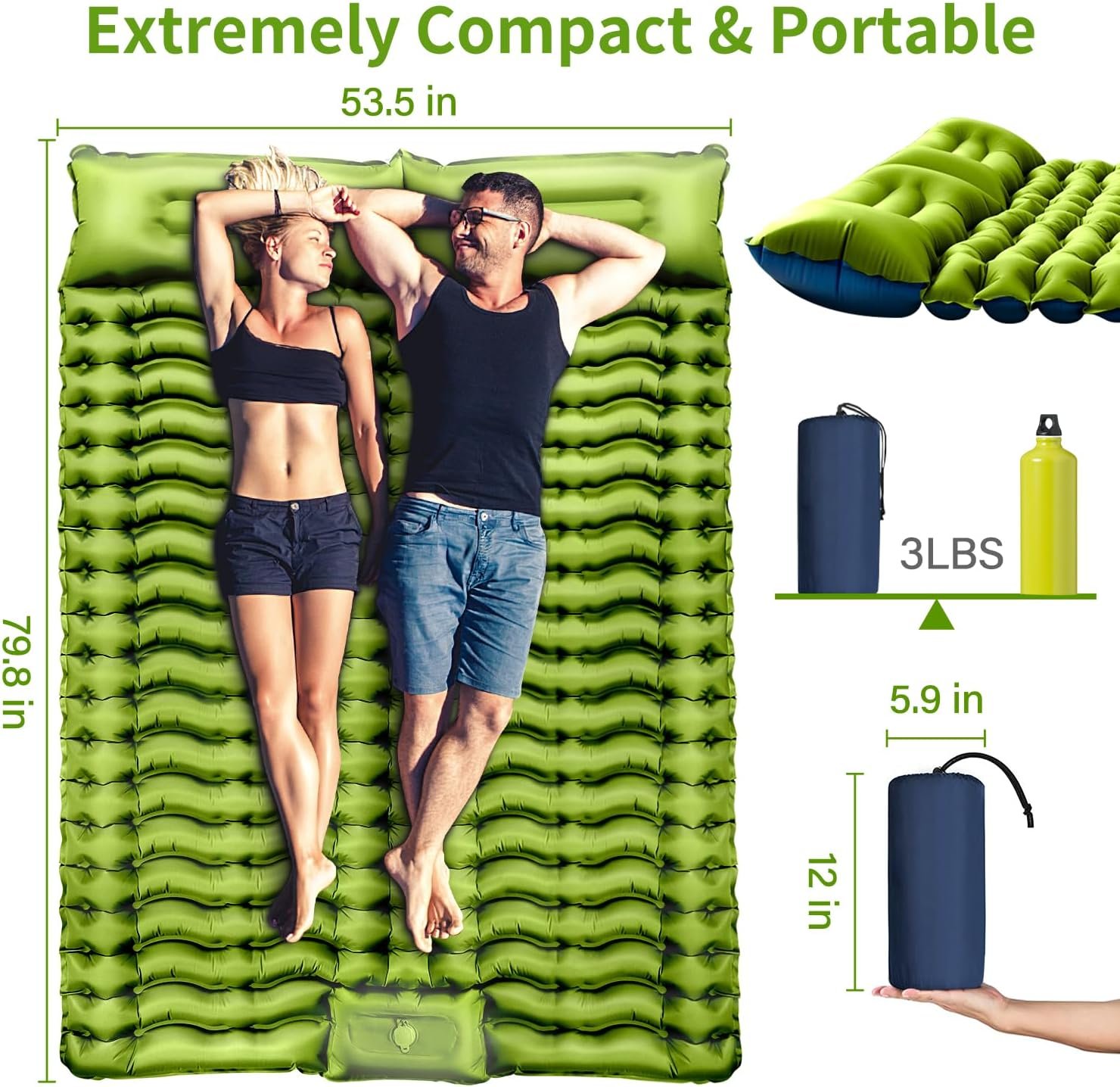 【4‘’ Ultra-Thick Double Sleeping Pad with Pillows】Camping sleeping pad is designed with a larger size and thicker: 79.8” X 53.5” and 4 inches extra thickness after inflating, which provides generous space and strong support, big enough for 2 person, won’t touch the ground no matter how you flip, camping pad built-in pillows are suitable for every sleeping position and gives you every comfortable and warm sleeping night.