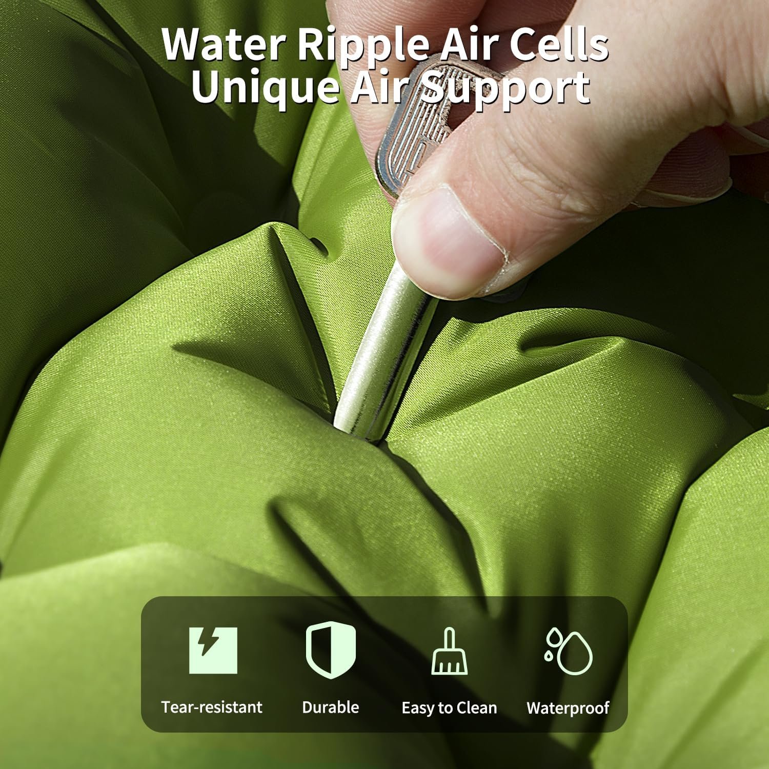 【Durable & Comfortable Camping Mat 】Our 2 person sleeping pad is made of ultra-tough 40D nylon and TPU coating for durability and tear resistant, making the mats suitable for a wide range of outdoor environments. Plus an ergonomic pressure-dispersing water ripple design and one-piece pillow, air pad providing ultimate comfort whether you are lying on your back, side or stomach.