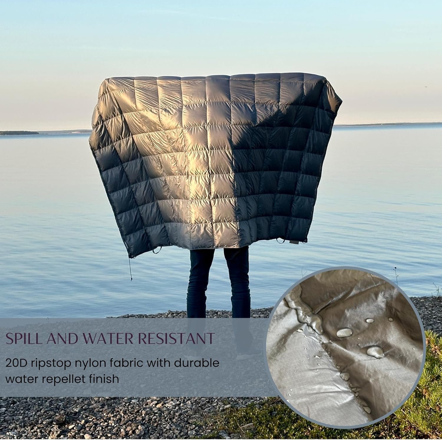 SPILL AND WATER RESISTANT – This compact travel blanket features a durable 20D ripstop nylon outer shell with a DWR (durable water repellent) finish, protecting against spills, rain, dirt, sand, and pet hair. Perfect for outdoor adventures, it ensures reliable performance in various weather conditions.
