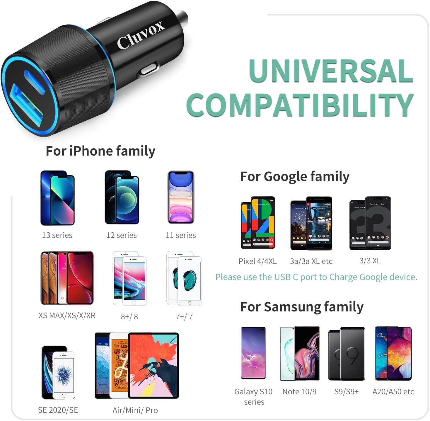 Universal Compatibility: Upgraded Car phone charger compatible with Apple iPhone 16/15/14/13/12/11/XS/XR/X/8 series, Samsung Galaxy series, Google Pixel series, Moto, and more