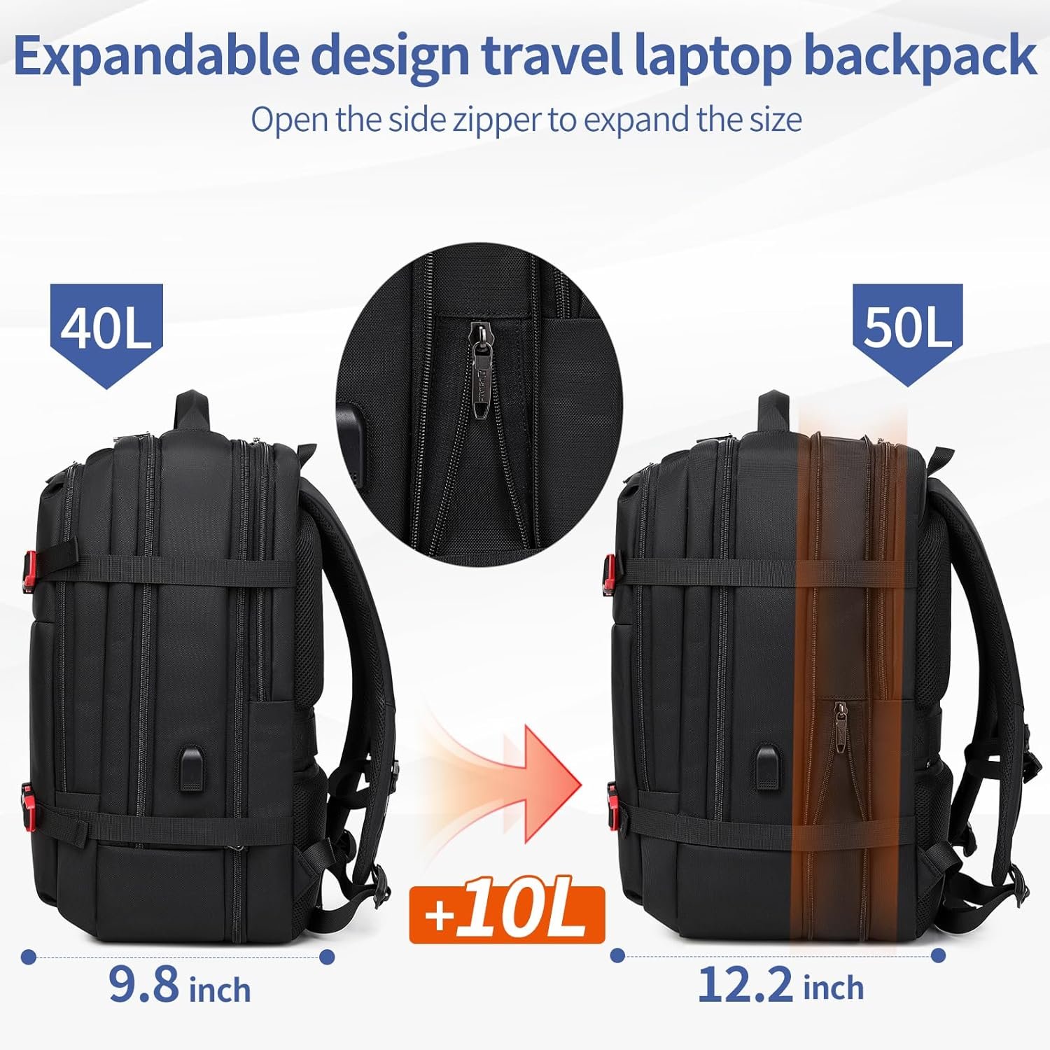 EXPANDABLE DESIGN: It is a expandable backpack,before extended is 40L and after extended is 50L,with expandable design zipper on the side,when you use as a daily backpack for work, you can keep the original size,as a travel backpack or business backpack,you can extend the capacity to fit all you need.
