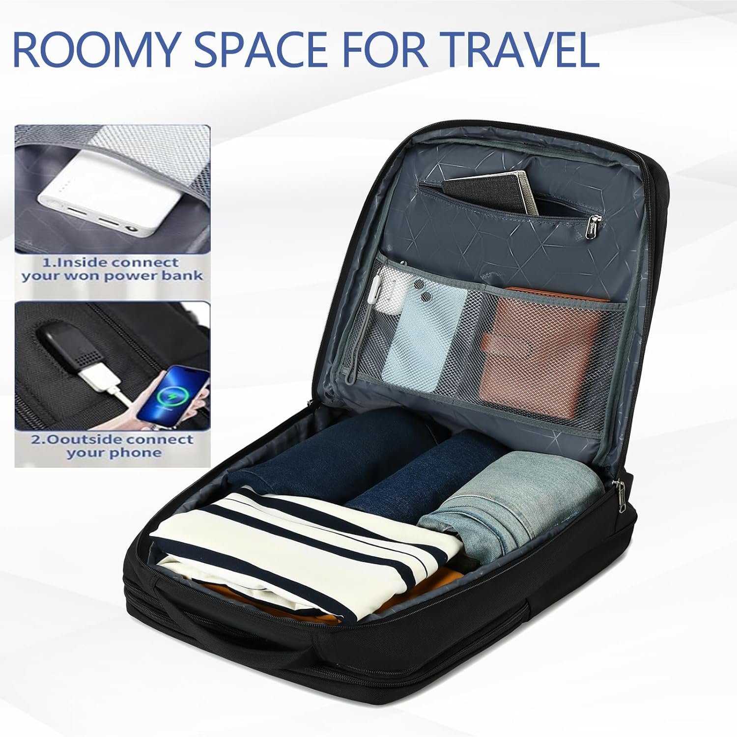 USB CHARGING PORT:Business backpack with USB charging port,when you are outside you can charge your phone anywhere and any time to make sure your phone is full power.2 steps to use the USB charging port:1.Inside connect your won power bank,2.Outside connect your phone.Please note:The power bank is excluding,you need to buy a power bank.
