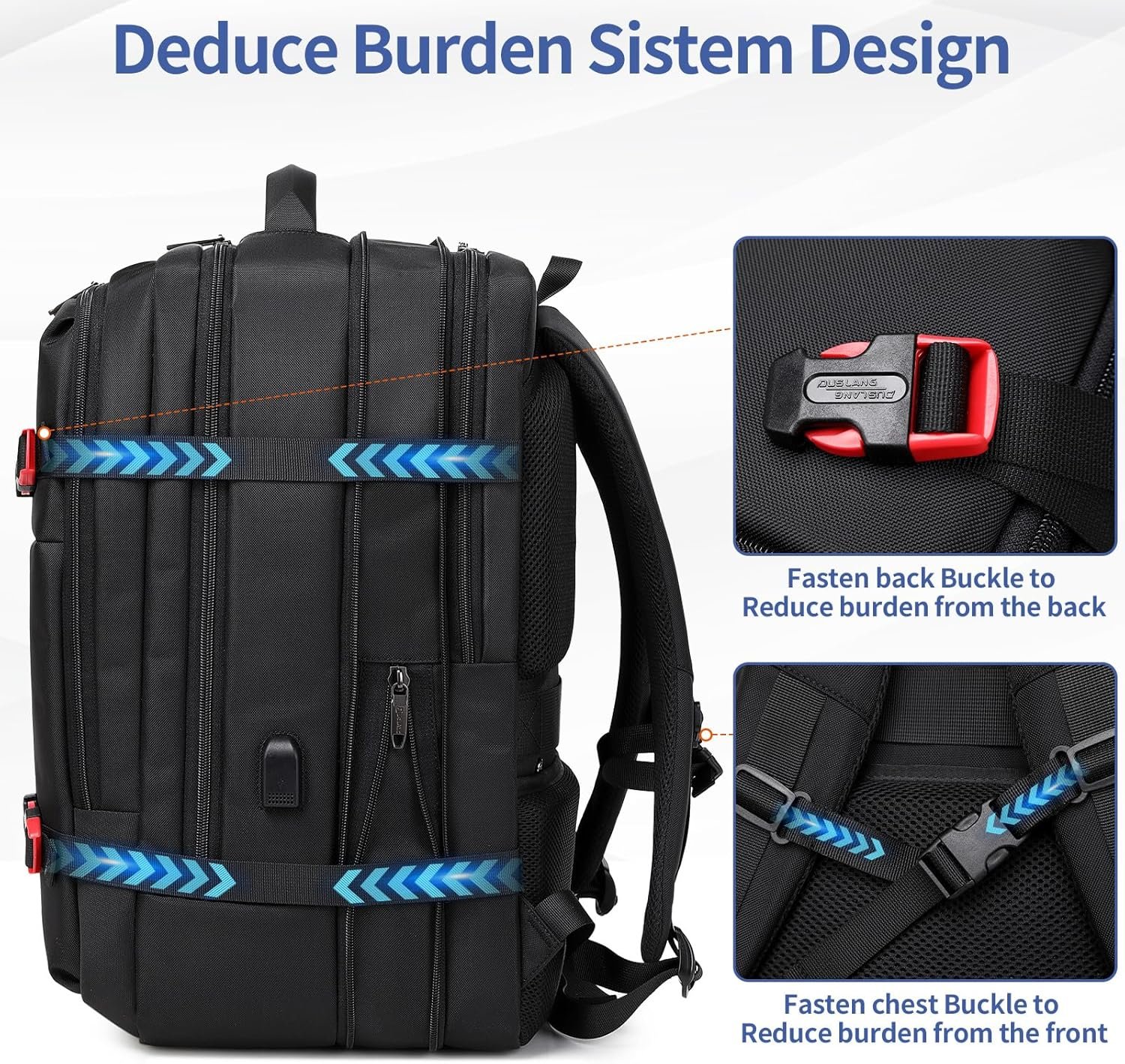 DEDUCE BURDEN SISTEM DESIGN:This 50L expandable extra large travel backpack can fits lots of things,it’s reduce burden design,fasten back buckle to reduce burden from the back and fasten chest buckle to reduce burden from the front to make it’s not too heavy when it’s full. A great companion for commuting, business trip, hiking, travel, camping and other outdoor activities.