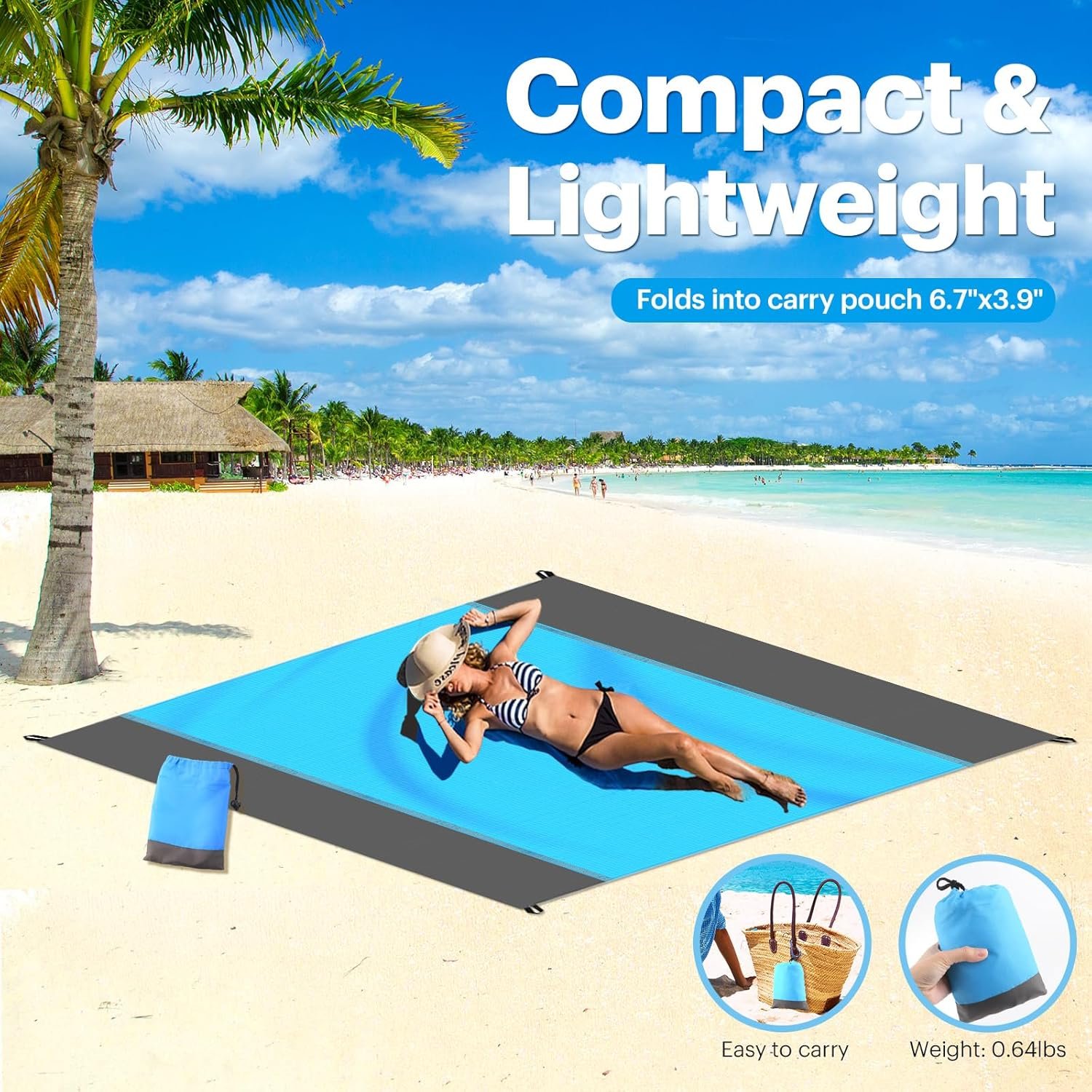 Oversize but folded up in a pocketsize. The blankets with attachedcarry bag is lightweight, compactand portable enough to put in yourbeach tote, badkpack or cargoshorts. Take it everywhere andamywhere with you.