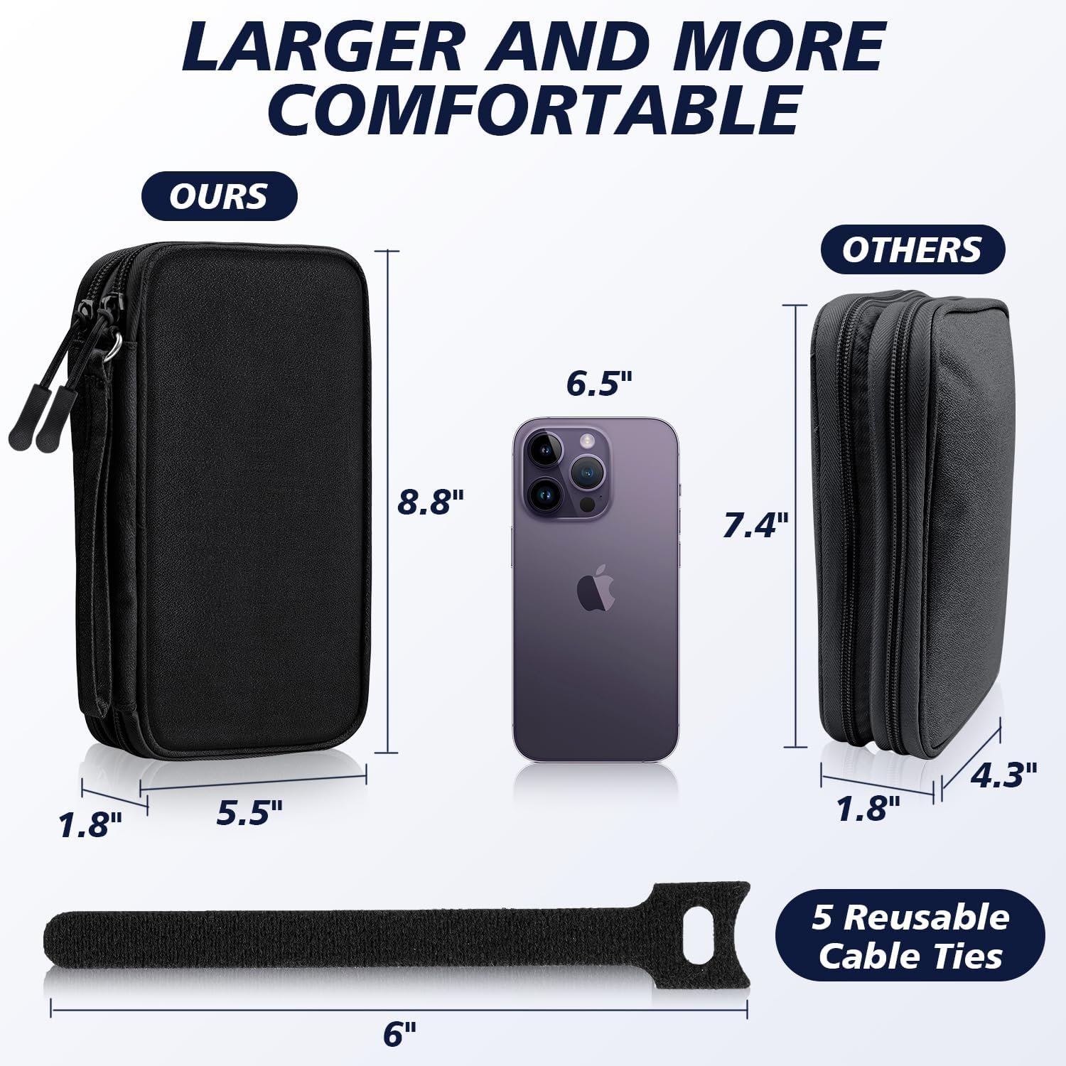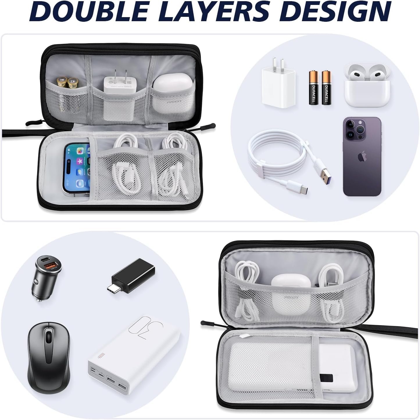 DOUBLE COMPARTMENTS – The charger organizer features a double-layer design. The front compartment has a large pocket and 5 mesh bags for cables, headphones, and chargers, while the back compartment offers two large pockets for power banks, pens, and a mouse