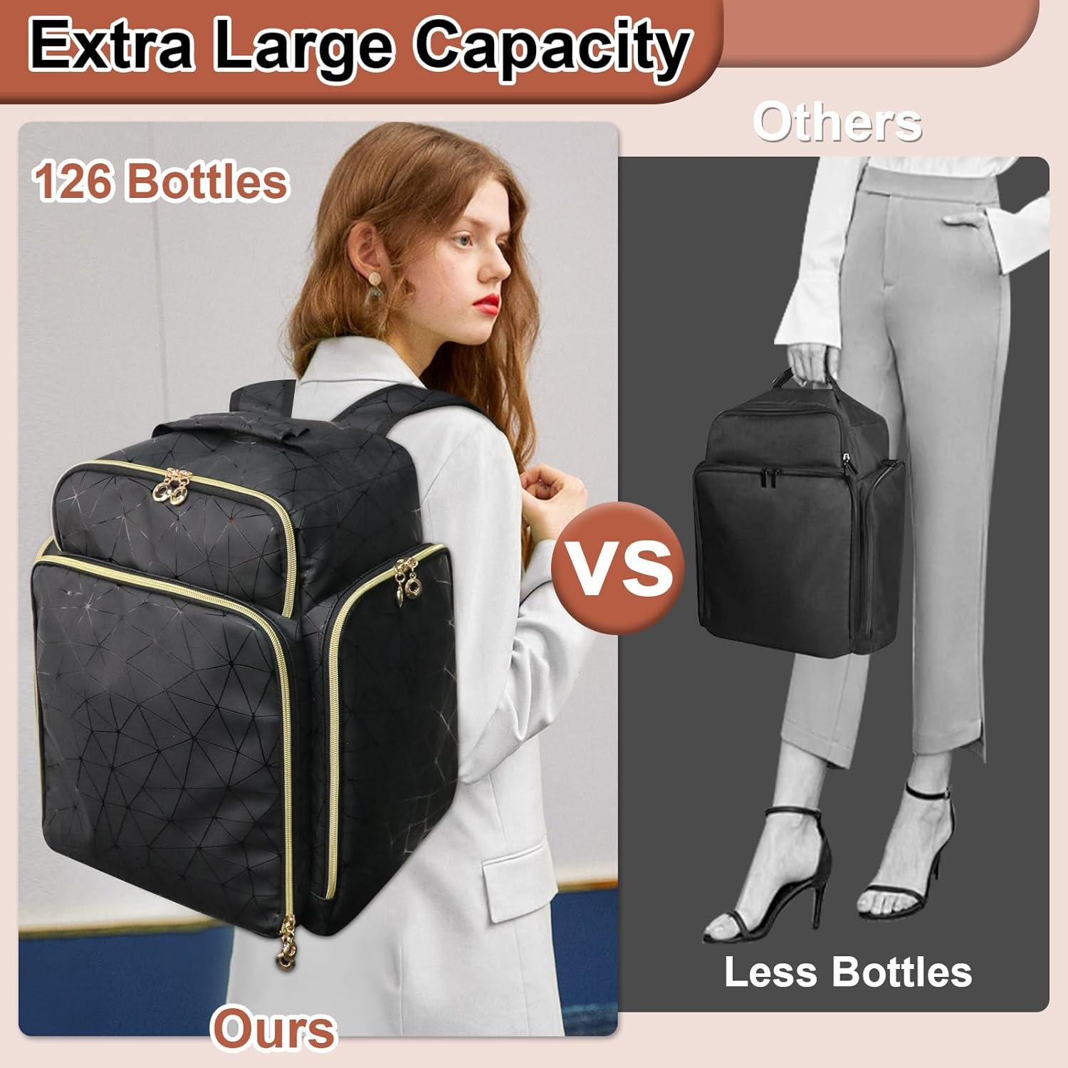 Elegant Black Backpack Organizer, Holds 126 Nail Bottles, Extra Large Nail Kit Supplies Storage with 3 Removable Cases, PU Leather Organizer for Travel