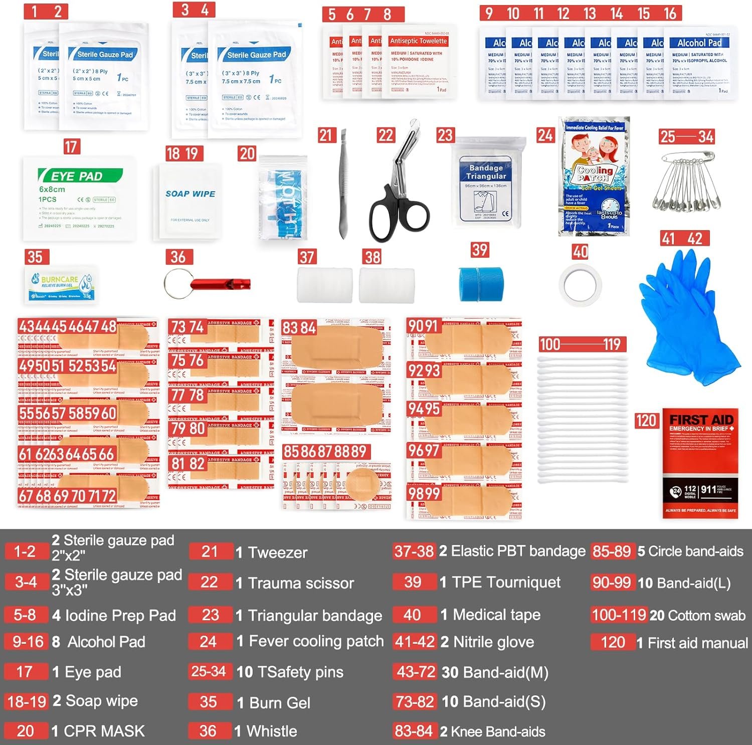 First Aid Kit for Home:Our home first aid kit is equipped with 120 first aid items, covering the essential items for dealing with daily emergencies. Whether it is a minor abrasion, burn, or various wounds, there are band-aids, tourniquets, bandages, etc. With this emergency medical kit, you can better cope with unknown situations and add a layer of security for yourself and your family. It is very suitable for children, adults and the elderly.
