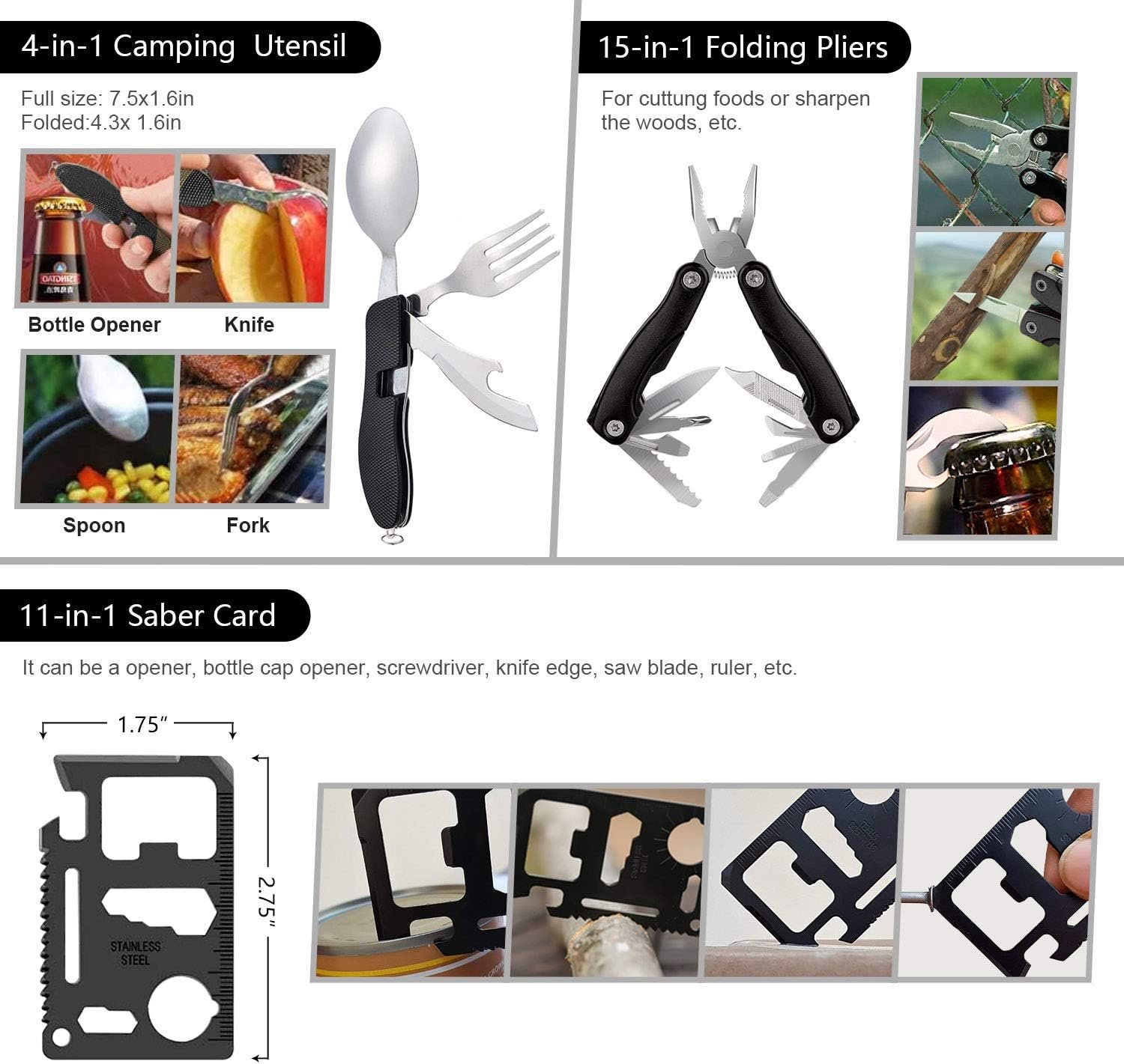 [Premium Survival Tools]: Includes the most useful survival tools: tactical folding knife, fire starter, compass, folding pliers, flashlight, multi-function paracord bracelet and more practical survival gears. Emergency tent provides you a temporary shelter; thermal blanket can retain 90% body heat when you in cold. 12 inches survival axe includes the functions of chop, cut, split, chip, trim, open, and have a sharp blade and a protective Nylon sheath.