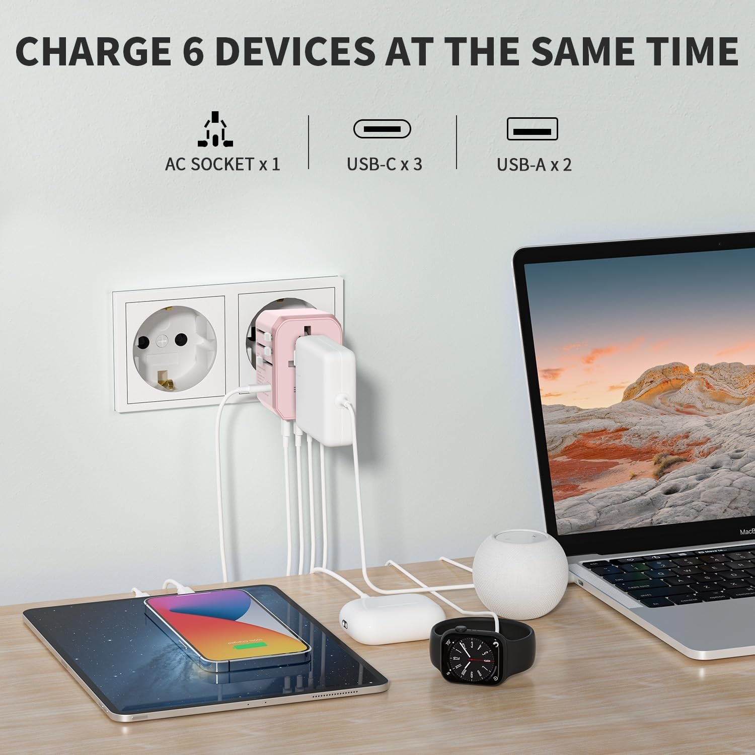 EPICKA Universal Travel Adapter, International Power Plug Adapter with 3 USB-C and 2 USB-A Ports, All-in-One Worldwide Wall Charger for USA EU UK AUS (TA-105C, Pink)