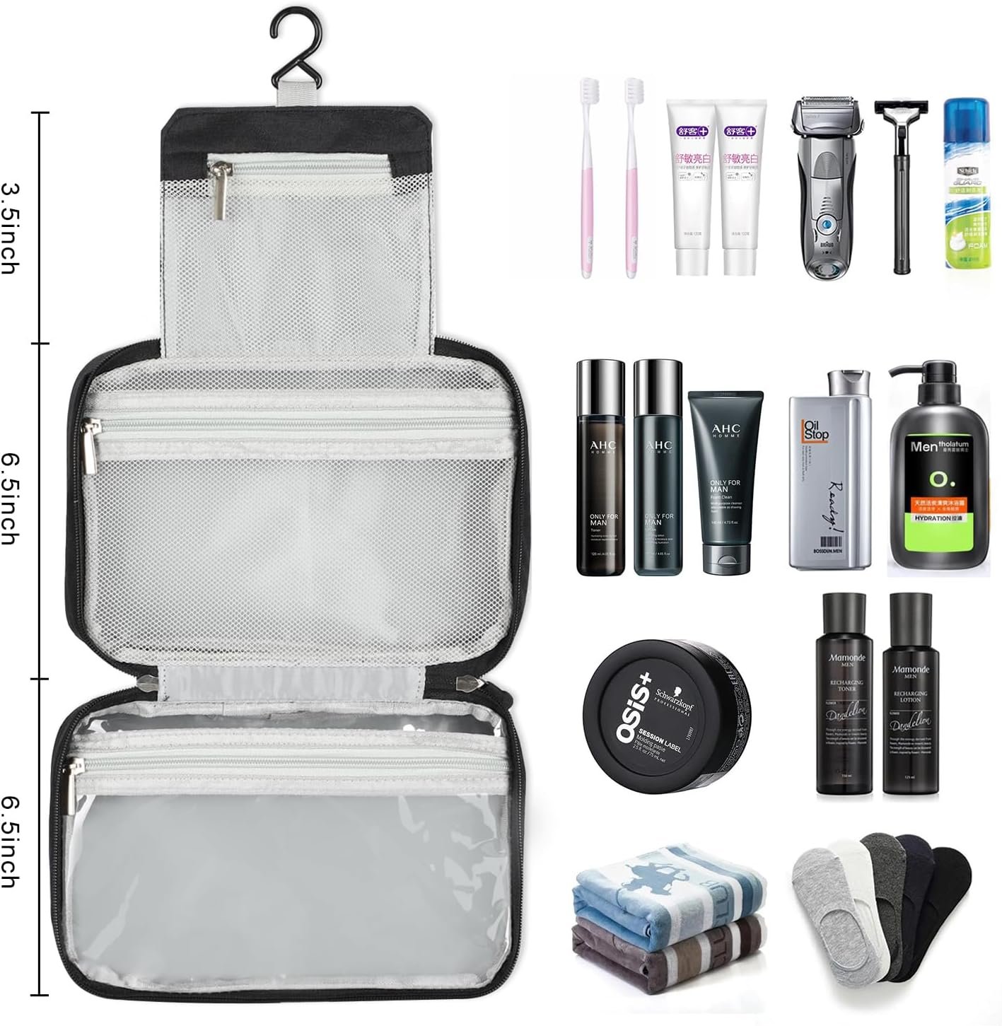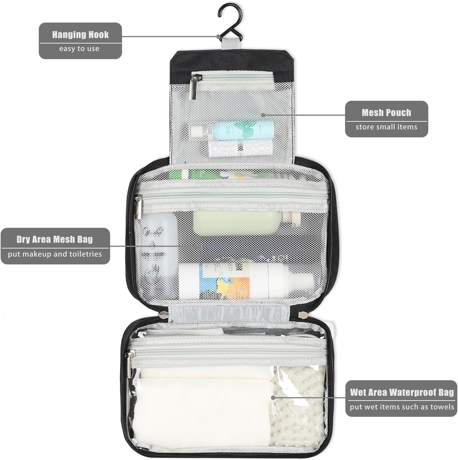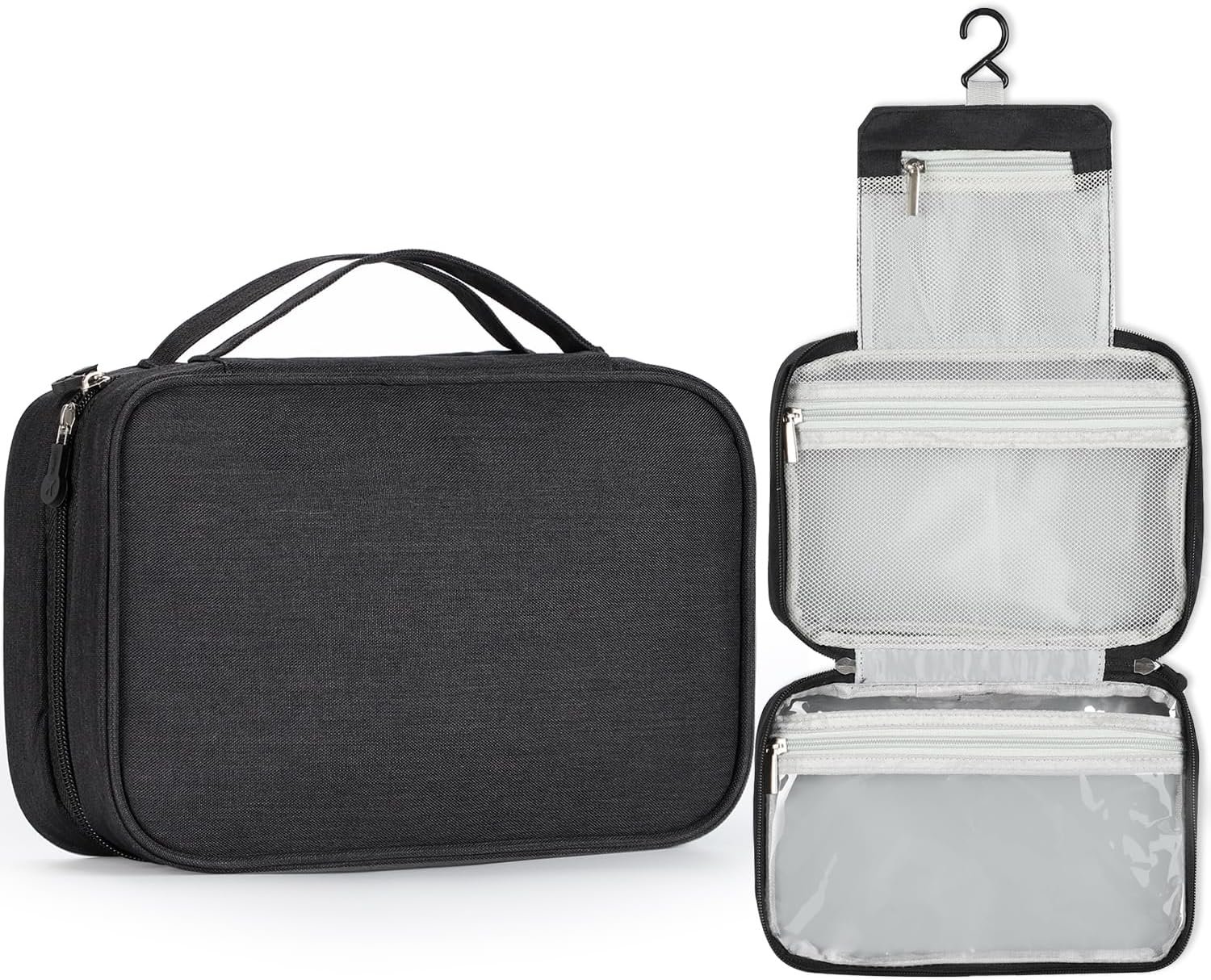 Hanging Toiletry Bag: Built-in hook allows hanging the toiletry kit from towel rack, coat hook or whereever is available, making your toiletries and cosmetics displayed well for quickly find what you need and save time