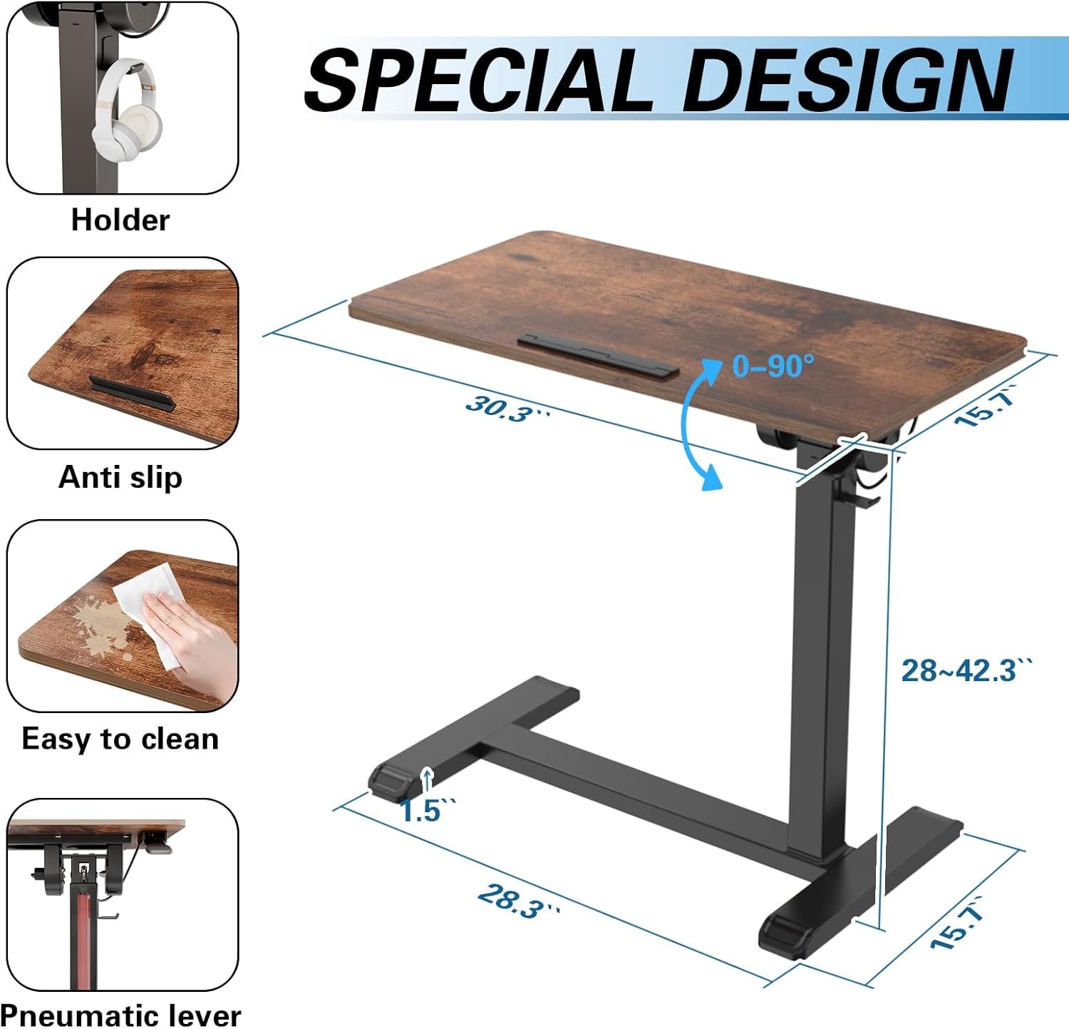 [HEIGHT ADJUSTABLE] The bedside table with pneumatic assist easily adjusts the height using one hand. It can be adjusted to any height between 28″ to 42.3″ in height for optimal positioning for any individual.