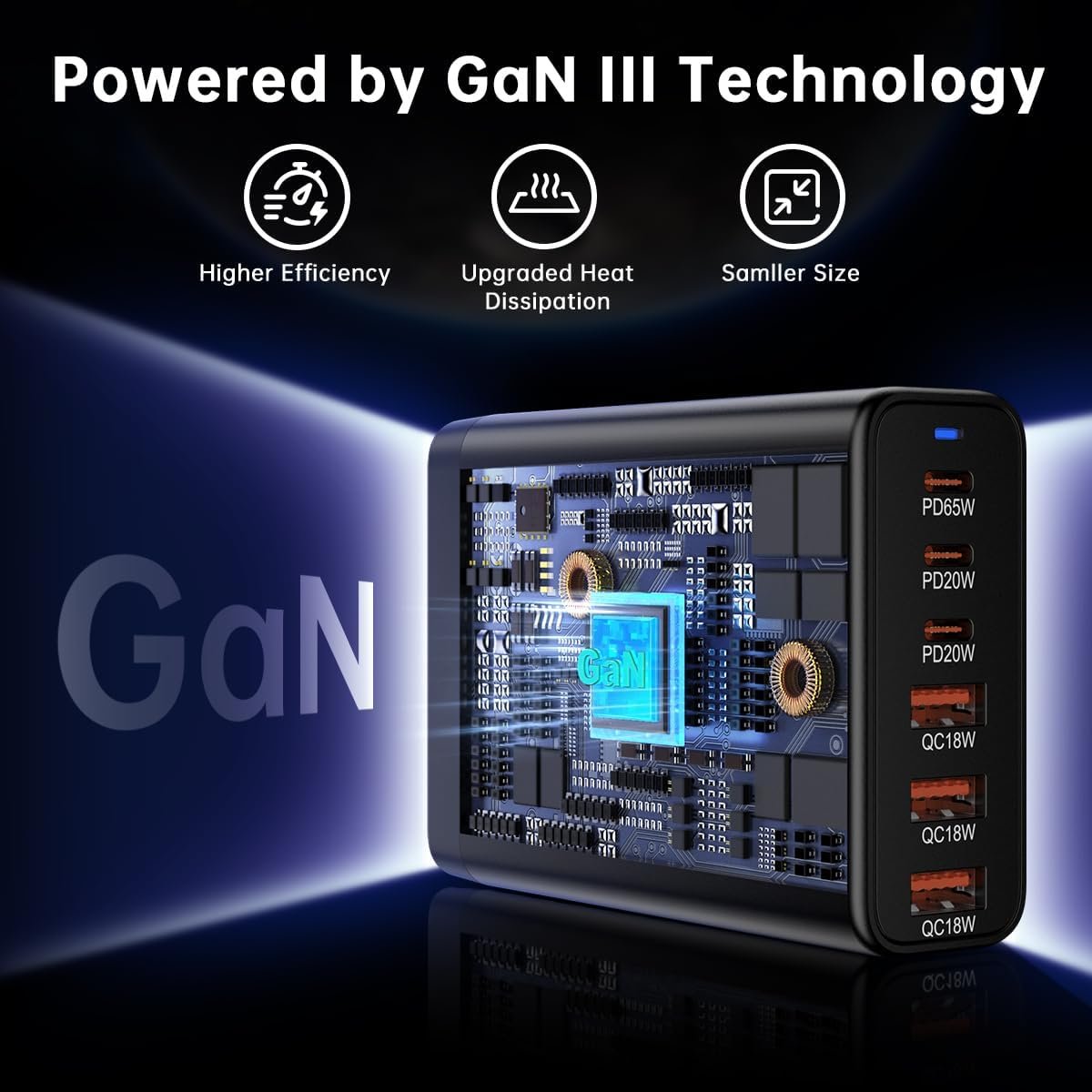 European USB C Charger Station Fast Charging Hub Europe Travel Power Adapter Multiple 6 Multi Port 120W GaN PD QC Block EU UK US Plug for Apple iPhone Samsung Pixel 65W Laptop MacBook Pro Air Surface