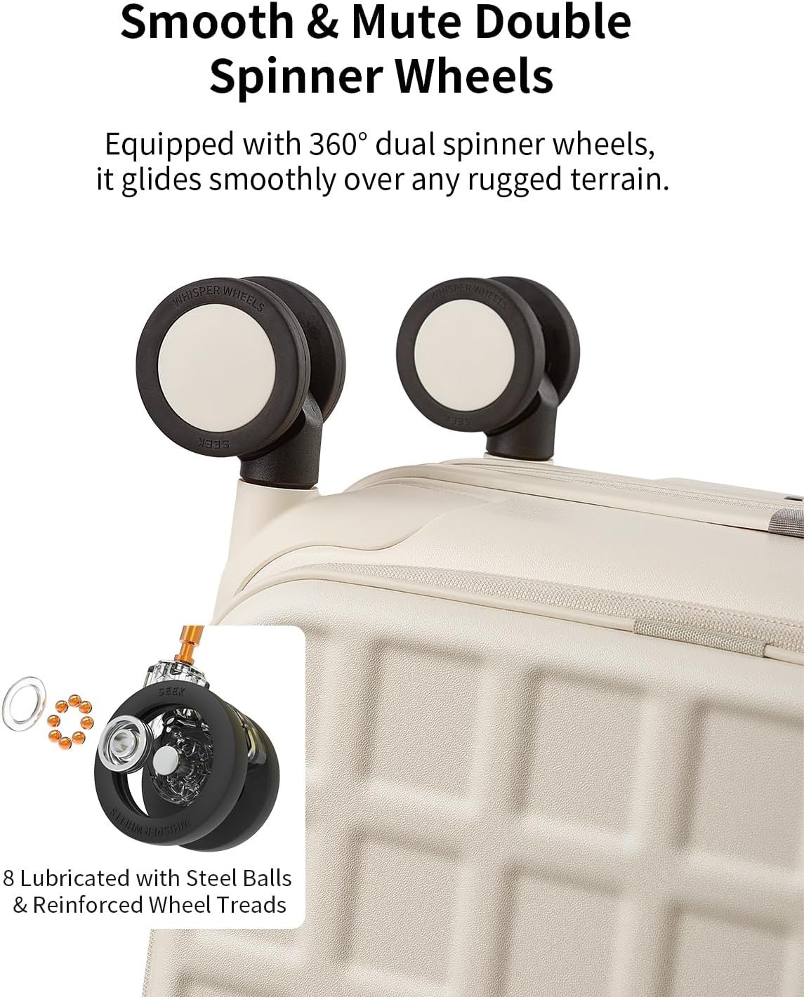 【SILENT SPINNER WHEELS】With 360-degree spinner wheels, this luggage moves smoothly on any surface. The noise-reducing design ensures quiet, hassle-free travel through airports, hotels, or city streets.