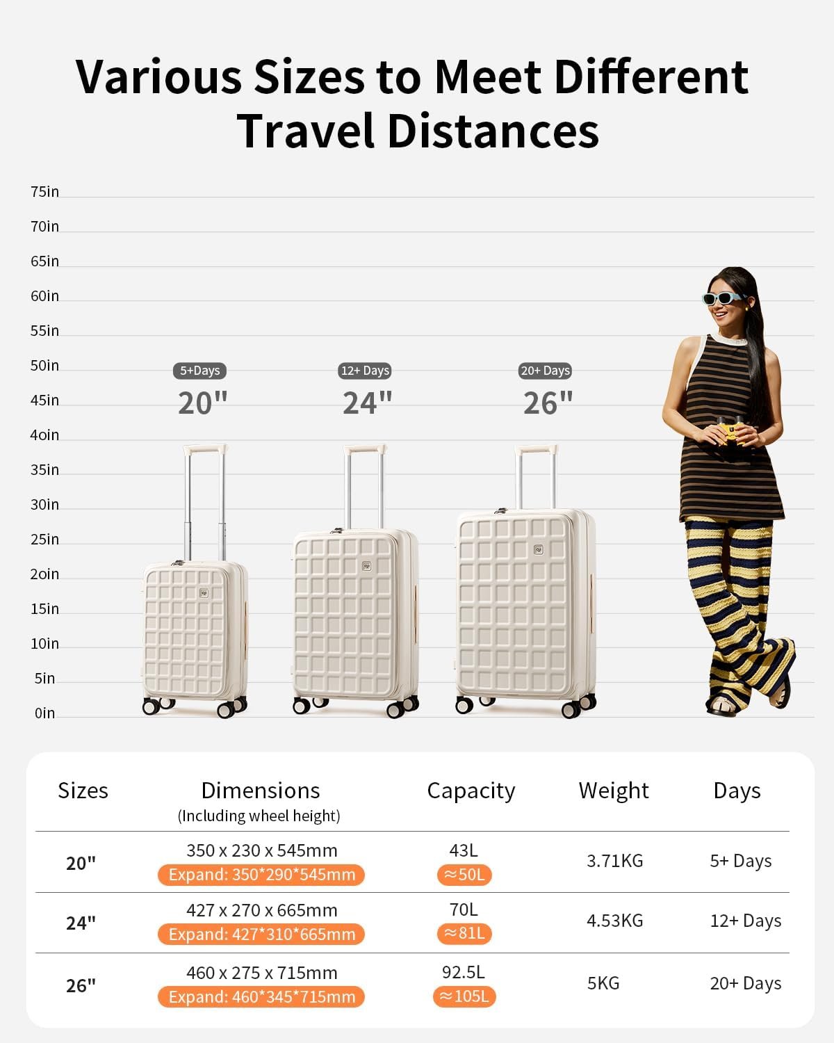 【PERFECT FOR 12-15 DAYS TRIPS】Overall Dimension: 16.8×10.6×26.2 IN (including wheels and handles), Expanded: 16.8×12.2×26.2 IN, Weight: 9.9 LB, Capacity: 70L(Expanded: 81L). This suitcase can also be a great wedding gift, vacations,birthday gifts and christmas gifts.
