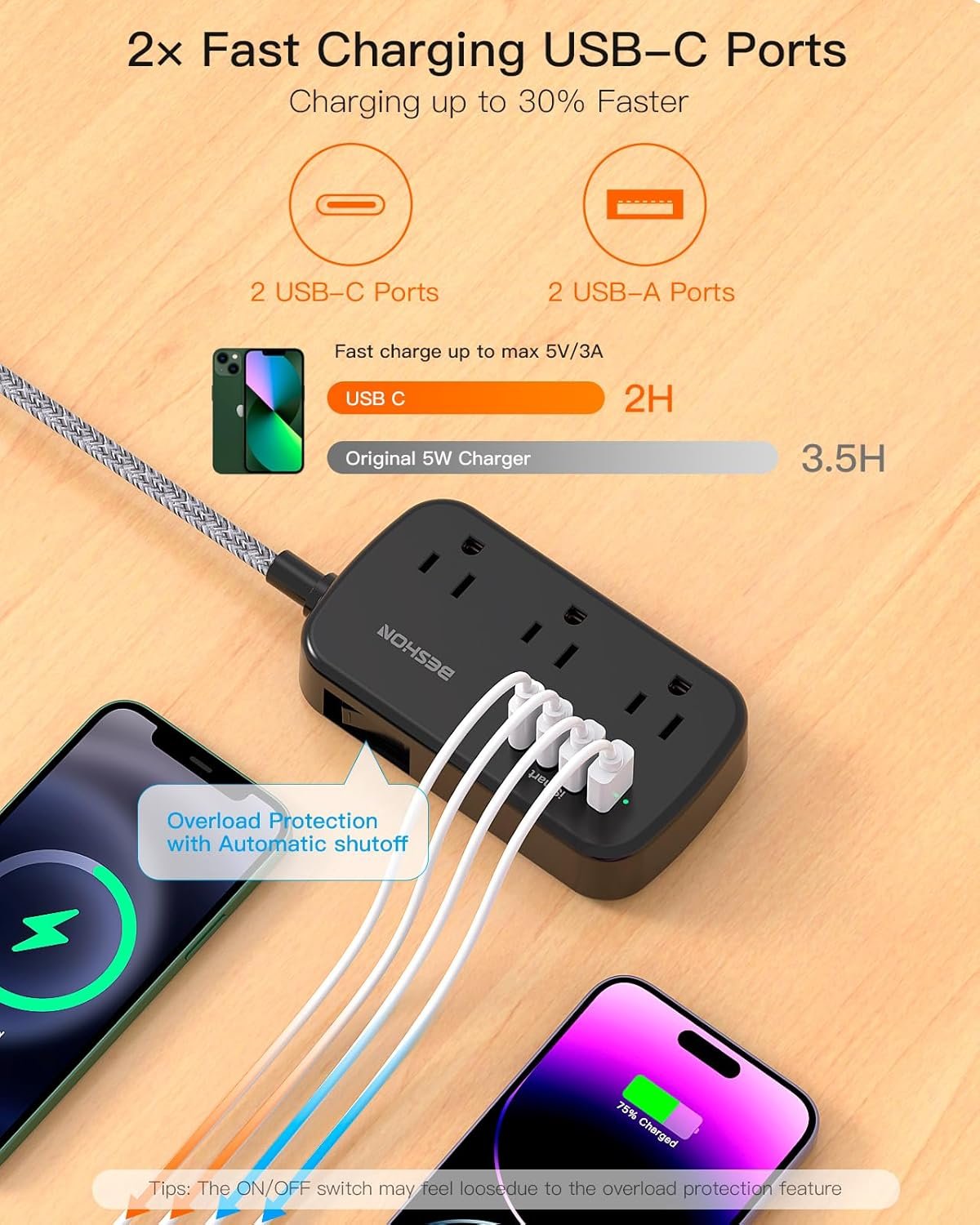 【2 x USB C Power Strip】Added extra 2 USB C ports for your devices, the USB C port can charge up to 5V/3A. USB-A ports can charge up to 5V/2.4A Max, all USB Ports Output is 5V/3.1A, 15.5W max which is 30% faster than other power strip. With smart charging technology, it can auto-detect your devices and can reach faster charging efficiency, perfectly fit for your iPhone, iPad, etc.