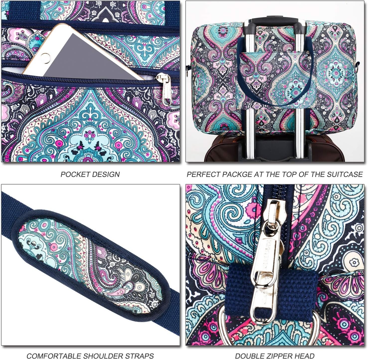 【Elaborate Details】This travel bag comes with a comfortable cotton handle and padded, adjustable and detachable shoulder strap.The sleeve on the side allows bag to side over the handle of your suitcase.