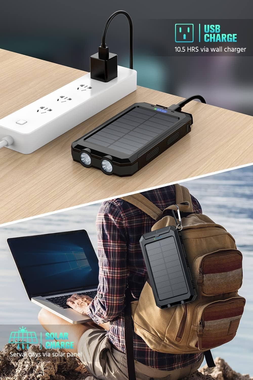The Solar charger power bank is made of environmentally friendly silicone, high-strength ABS and PC materials, with a protective cover attached to the outside of the charging/discharging port, which is waterproof, dust-proof, and drop-proof, very durable. It also comes with a carabiner that you can attach to your backpack while hiking and charge this power bank with solar energy.