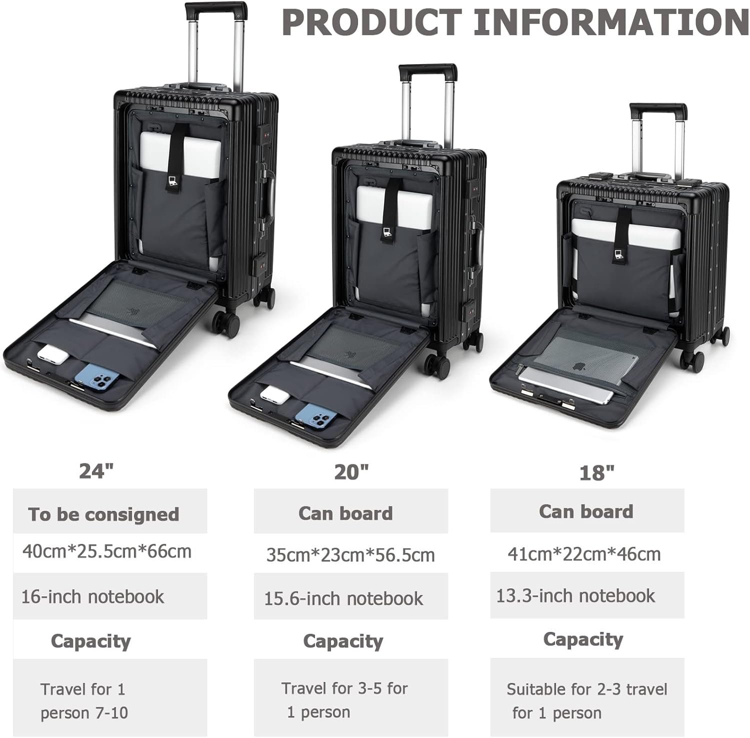 Convenient Front Opening Cover: The front open cover is most suitable for placing your laptop or iPad. You can easily access iPad/Laptop Computer just keep the suitcase keep standing without placing your suitcase on the ground.(Please note the size of the iPad between different suitcases that you can placed.You can refer the picture we provided.)