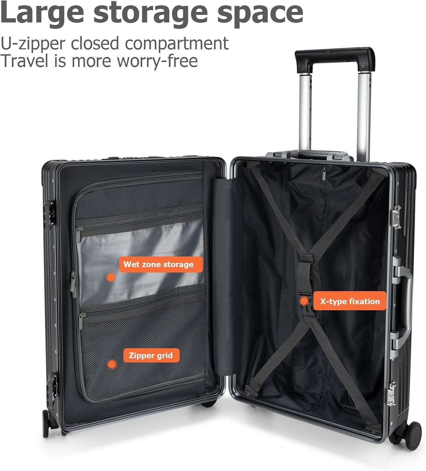 TSA Lock & Anti Noise Wheel: Mounted TSA LOCKS extremly improved safety,ensuring that only you can easy access to your belongings when traveling;4 multi-directional spinner wheels for effortless mobility, lightweight, can be easily reduce noise when moved.