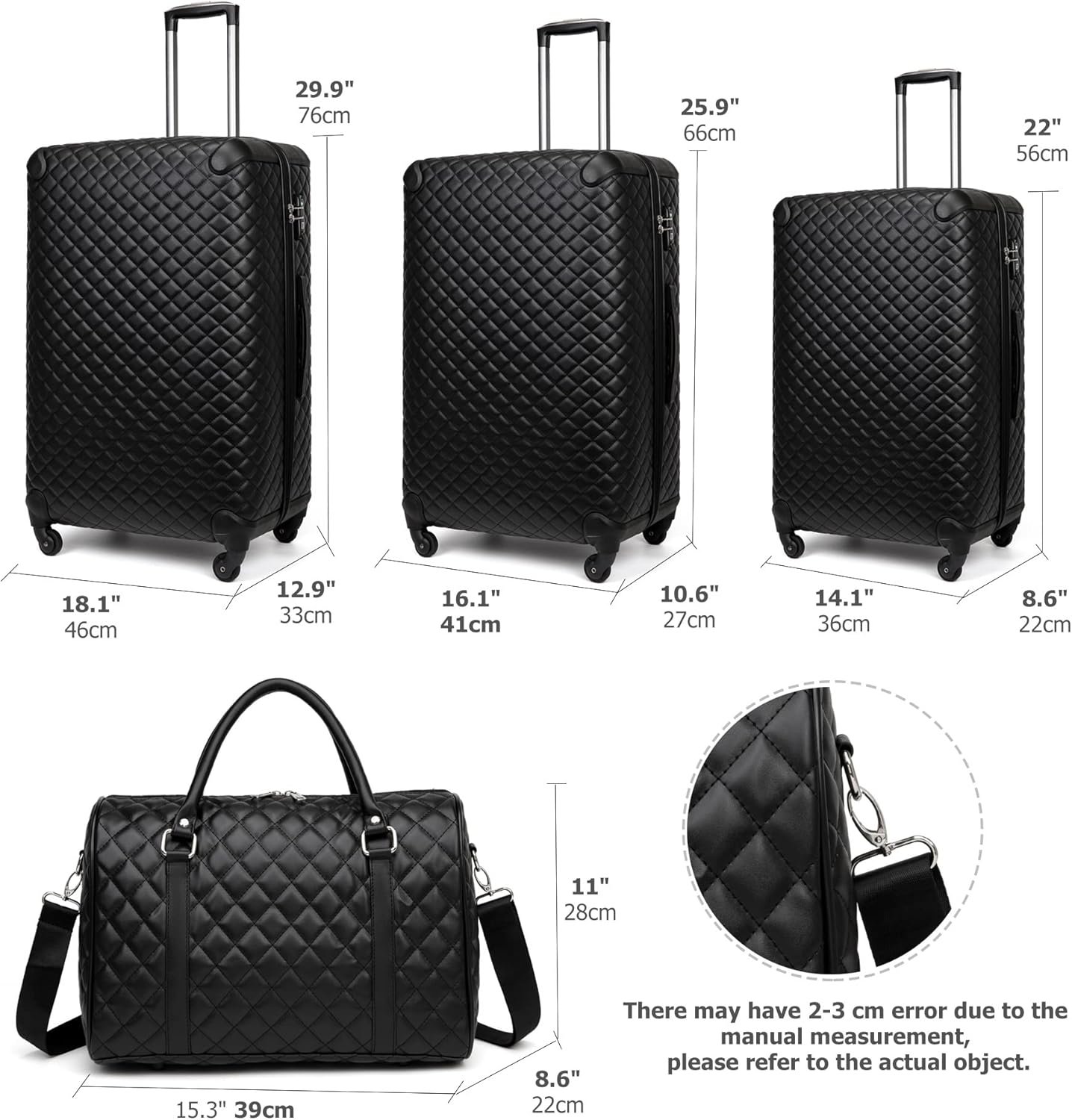 The Luggage Set Dimensions & Weight: The travel bag 1.7lb/15.3″(39 cm)L*8.6″(22 cm)W*11″(28 cm)H ; 20in 6.7lb/14.1″(36 cm)L*8.6″(22 cm)W*22″(56 cm)H; 24in 8.8lb/16.1″(41cm)L*10.6″(27 cm)W*25.9″(66 cm)H; 28in 11.8lb/18.1″(46 cm)L*12.9″(33 cm)W*29.9″(76 cm)H.
