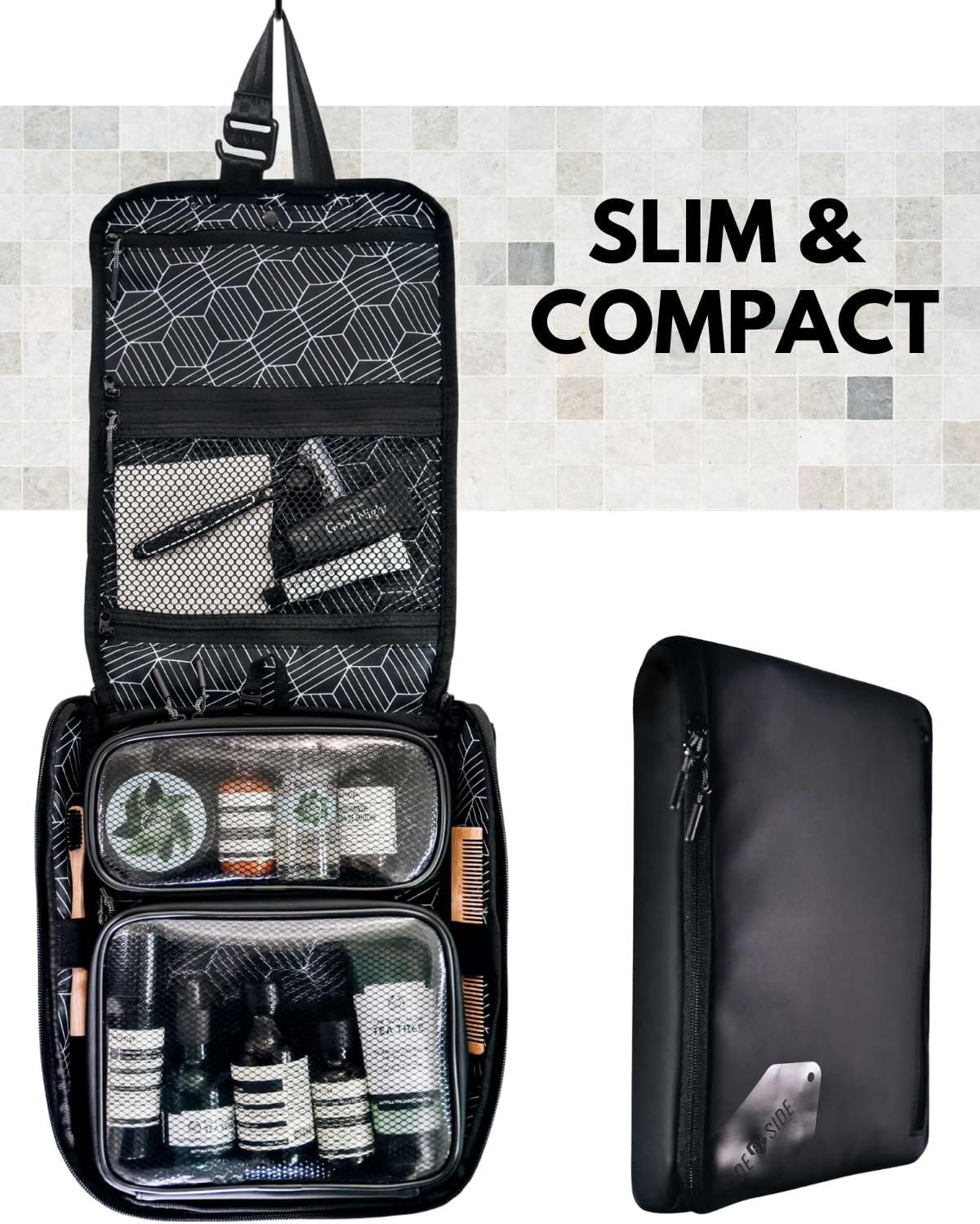 SLIM & COMPACT – With dimensions of 11.02 x 8.46 x 1.57 inches (28 x 21.5 x 4 cm), this minimalist travel design prioritises organisation and storage efficiency. Features include: one mesh pocket for ventilation, one discreet pocket, two elastic loops, and two detachable leak-proof dopp cubes (small and large sizes) with dual zipper pulls. Additionally, it comes with a strap with a hook for hanging, maximising travelability.