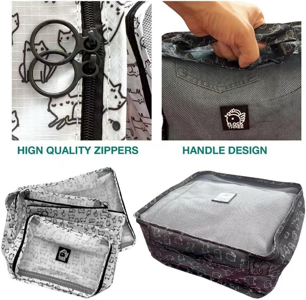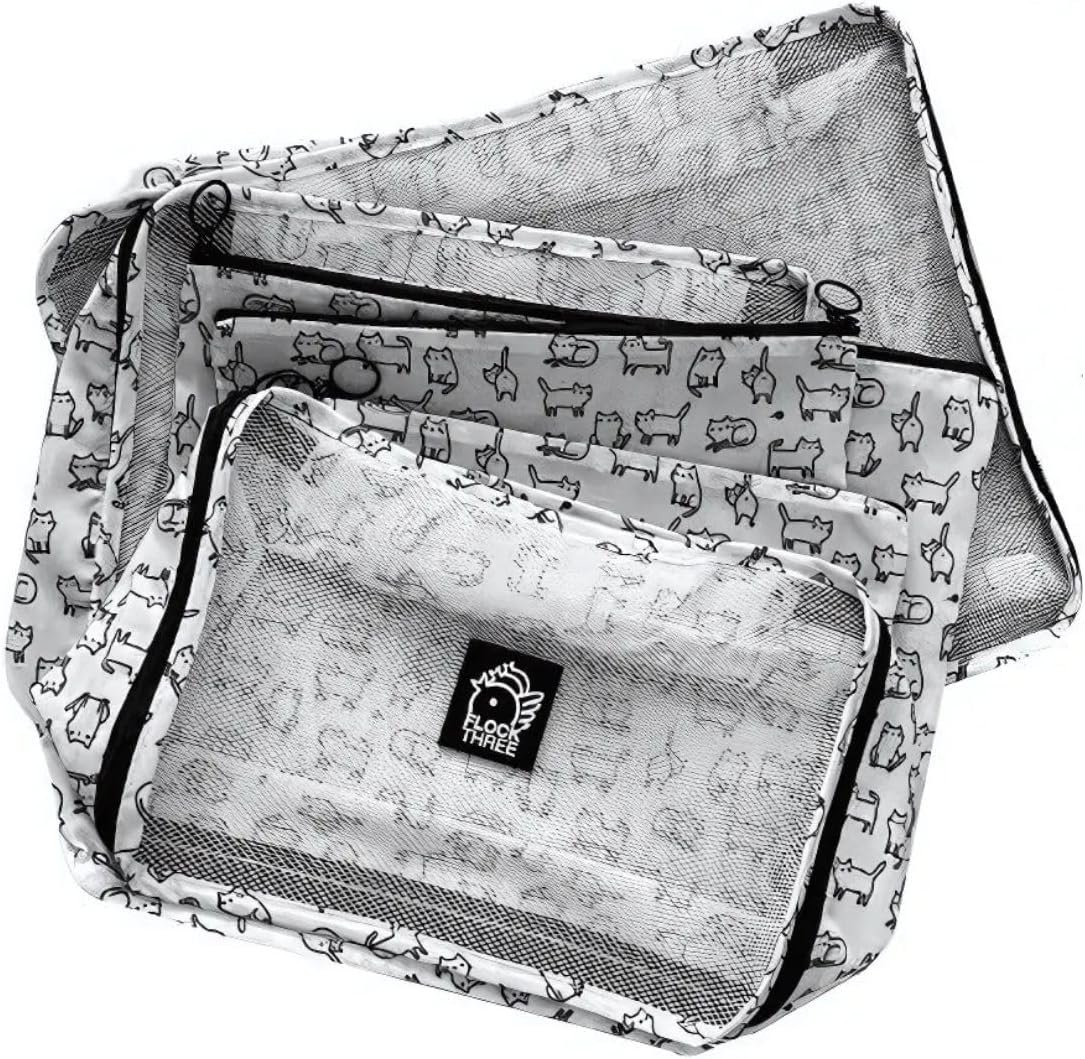 Flock Three 6 Set Mesh Compression Packing Cubes for Travel w/See Through (3 in 6), Suitcase Essentials Organizer Bags Set for Luggage, Road Trip Travel Accessories w/Cute White Cat Pattern