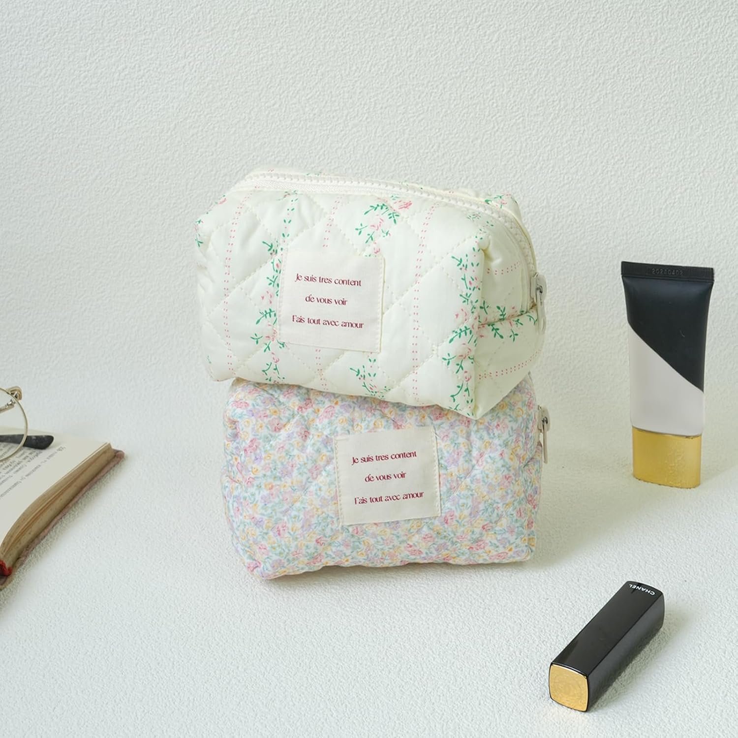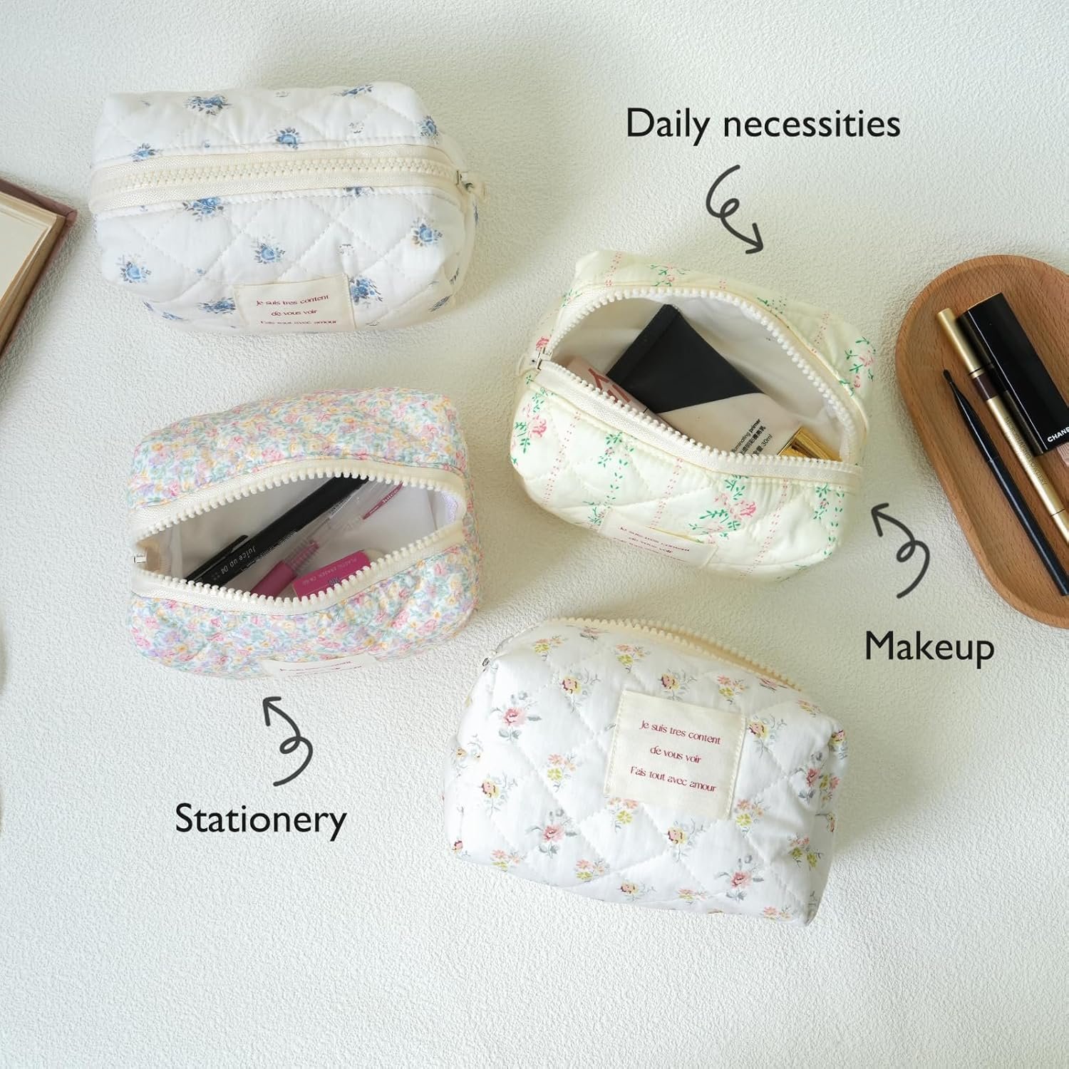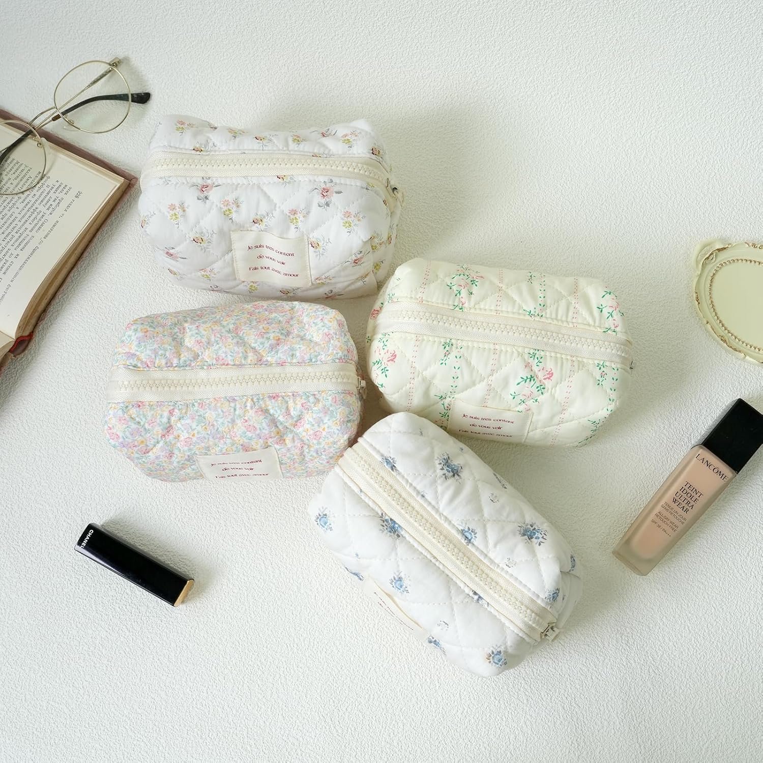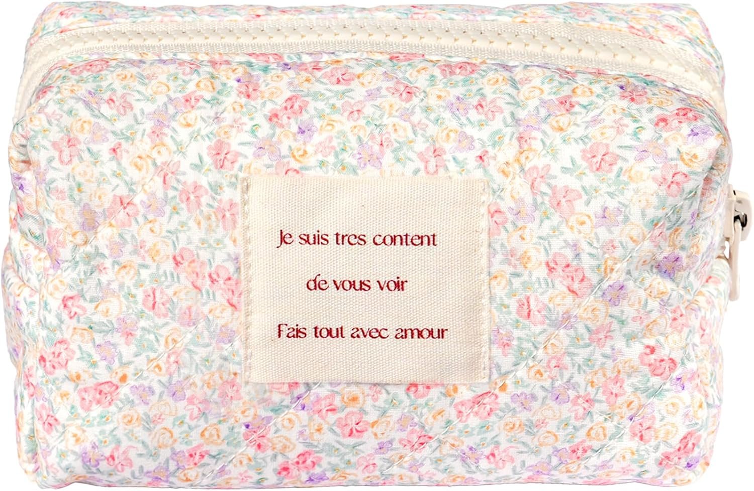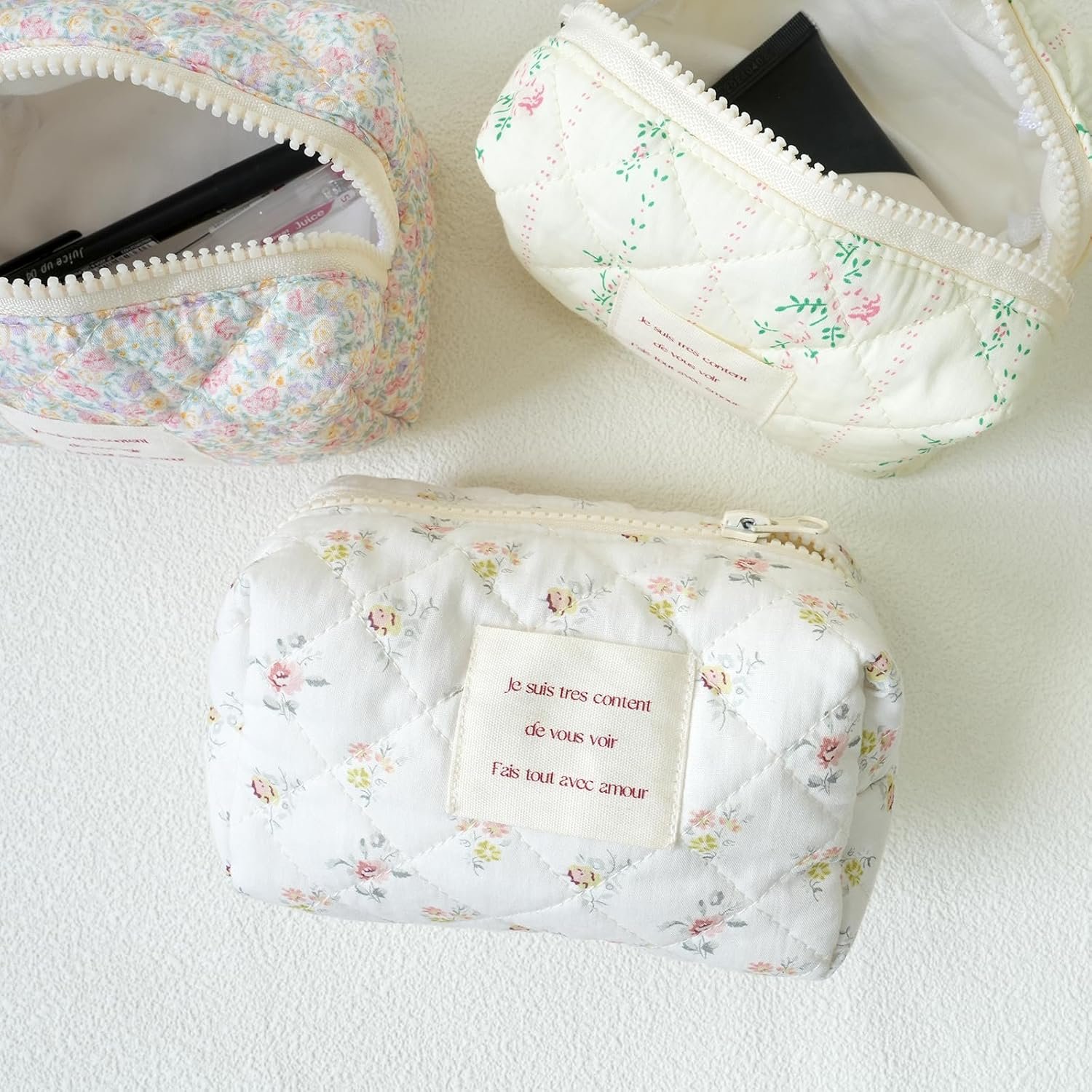 Sminra Floral Makeup Bag Cotton Quilted Small Cosmetic Make up Bag Organizer, Cute Aesthetic Coquette Portable Pouch Toiletry Purse Bag for Women Girls Travel accessories