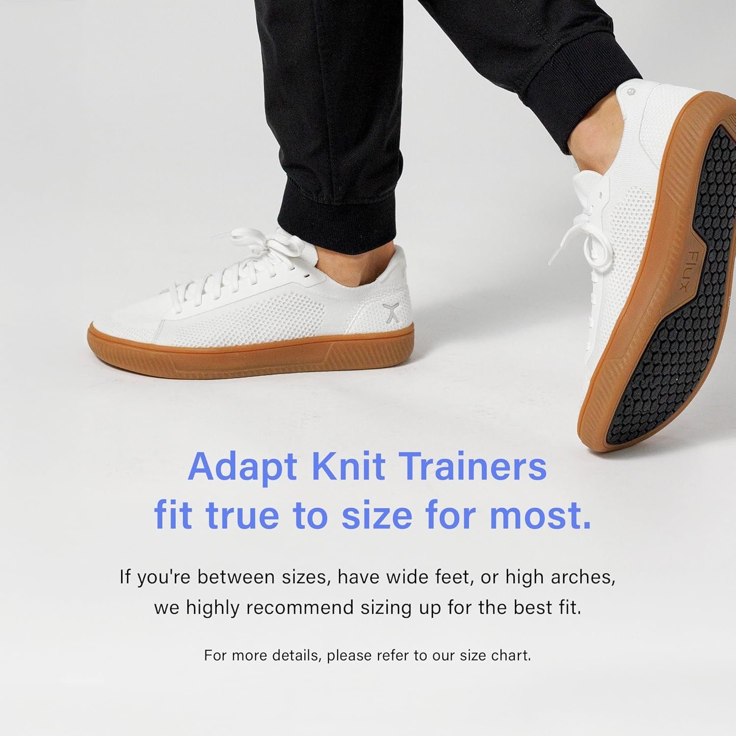 The Adapt Knit Trainers runs true to size for most, but if you’re between sizes, have wide feet, or high arches, we recommend sizing up for the best fit. For more details, refer to our size chart for guidance on finding your perfect fit.