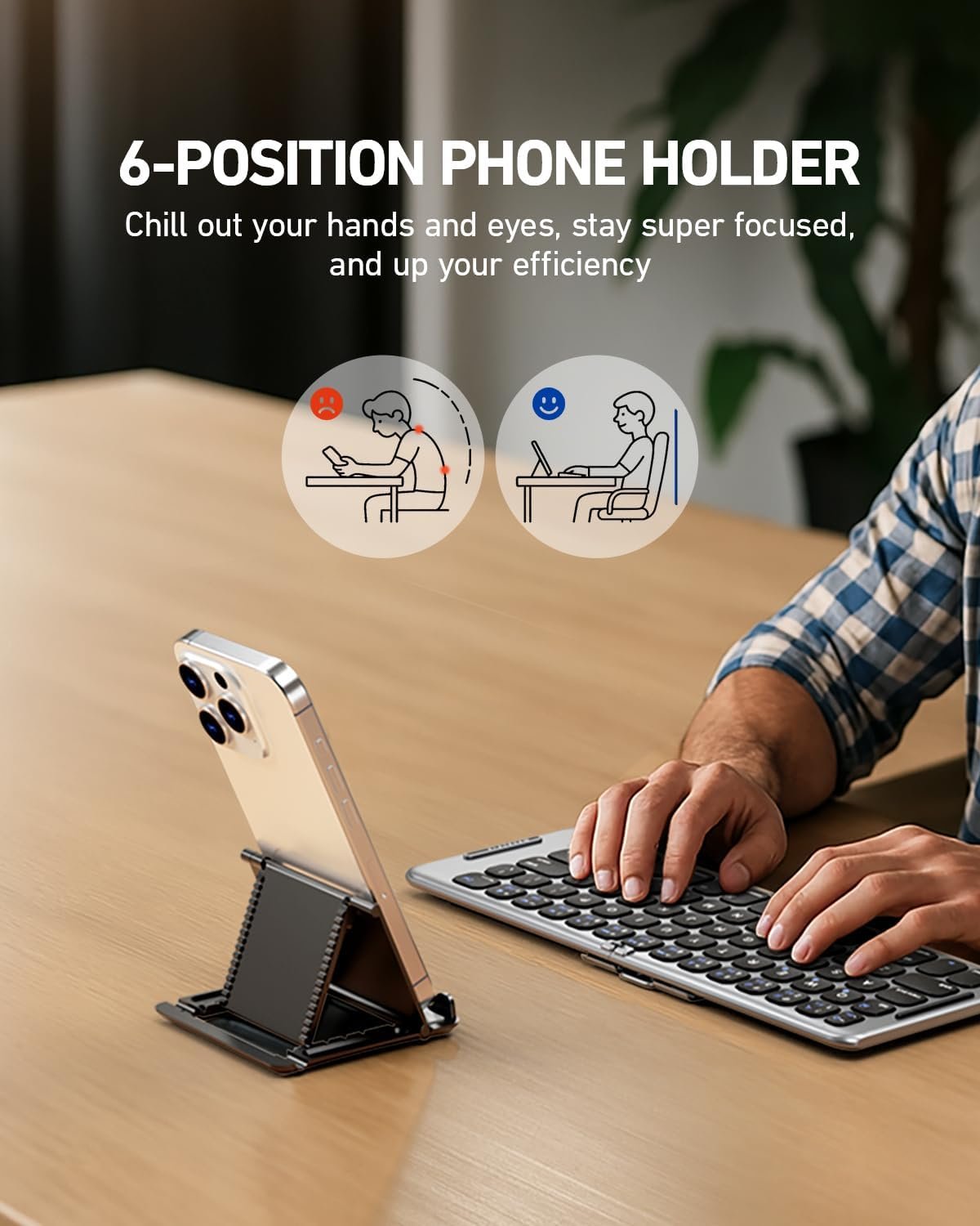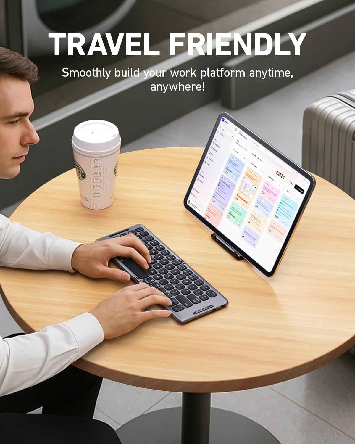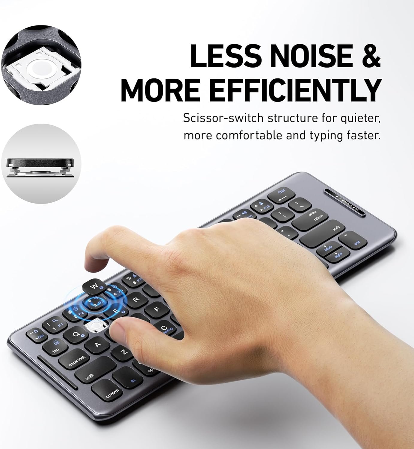 【Foldable Bluetooth Keyboard】Ultra-thin travel bluetooth keyboard for work anywhere, anytime. The fold up keyboard is designed with ergonomic principles in mind, featuring a raised bottom for added comfort and reduced fatigue during prolonged use. The full-size keycaps and seamless design make typing more accurate and faster, providing a laptop-like typing experience. Its compact size and lightweight construction make it perfect for travel and business trips