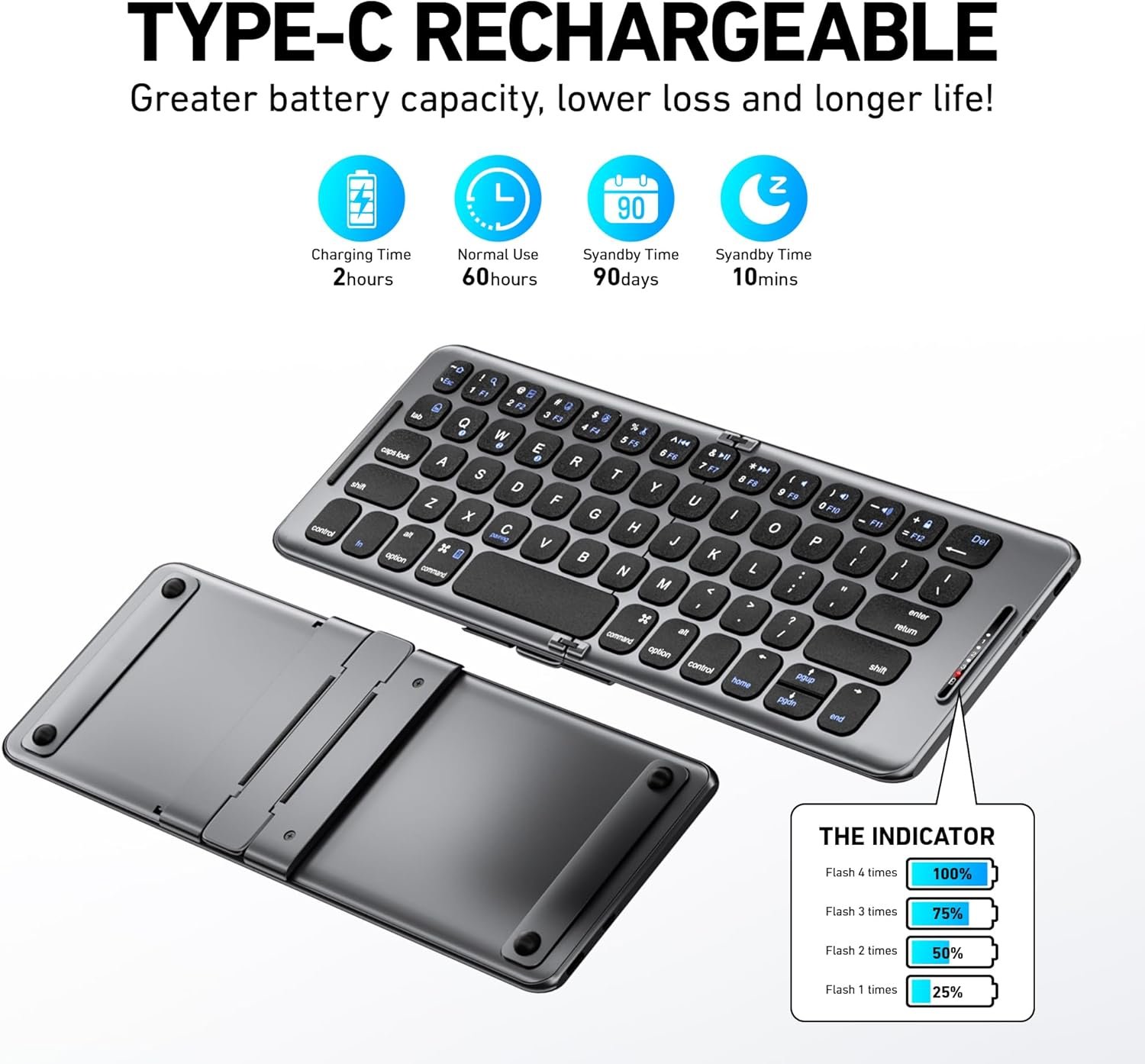 【Rechargeable & Portable】Bulit-in a rechargeable battery, the bluetooth travel keyboard has 3 months standby time in a single full charge. (Note: Type-C charging cable included). The phone keyboard enters sleep mode after ten minutes of non-use to conserve power. Folding Size 5.82″*3.97″*0.89″, it will easily fit in your briefcase or laptop bag. Perfect for using on planes, at library, cafes, or anywhere you want