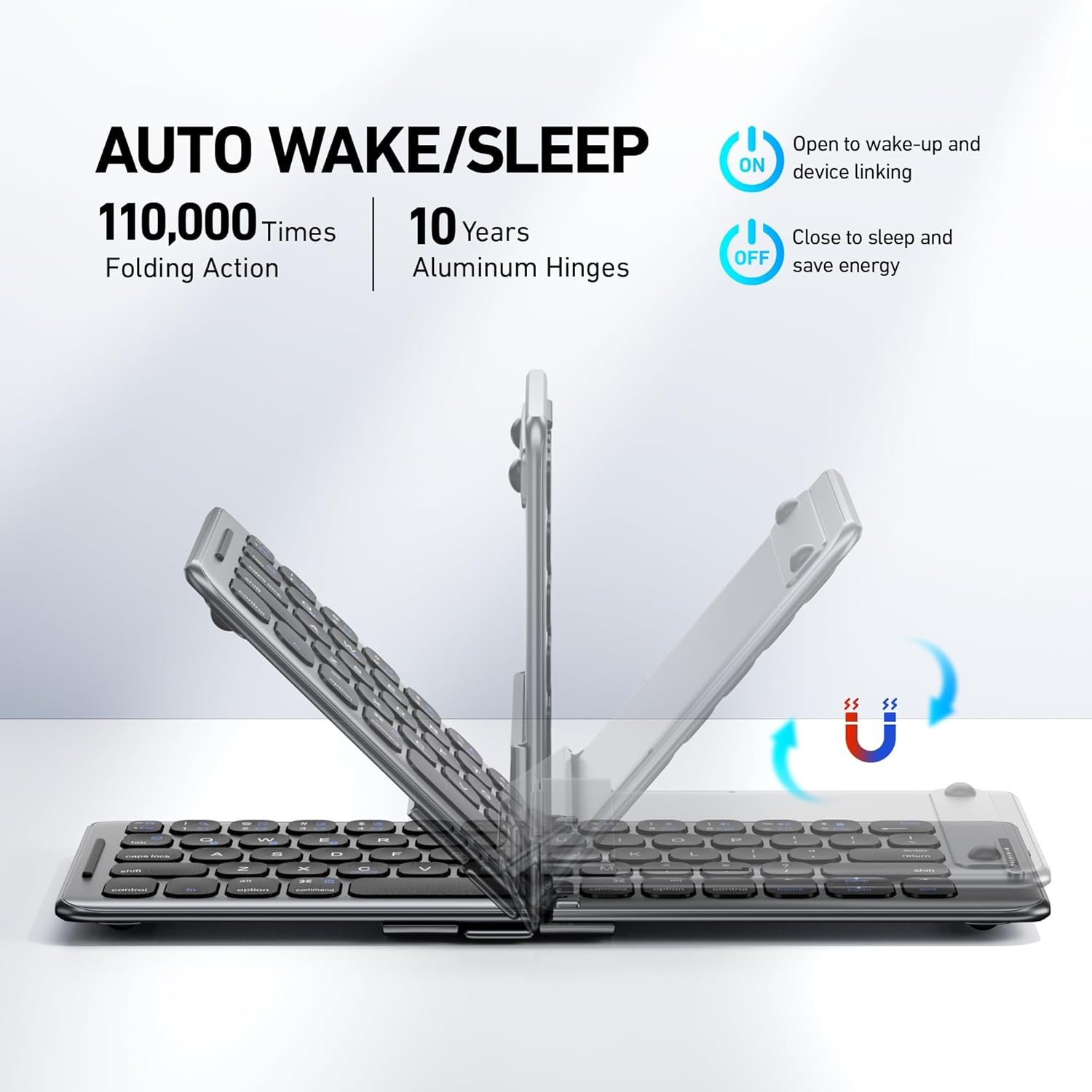 【Dazzling Appearance Design】Fold keyboard is made of high quality matte dark grey surface, durable ABS+PC material, anti-fingerprint and anti-slip. Alloy connecting shafts are durable and unobtrusive, ensuring smooth use even on non-flat surfaces. Very durable and impact resistant. It can be folded easily with magnetism and will not open easily when you carry it around in your bag