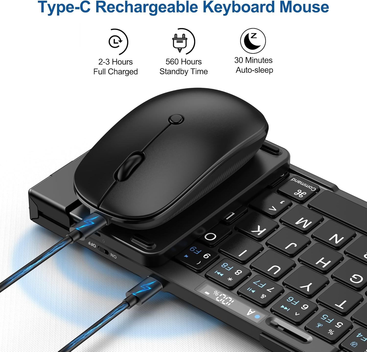 ▶【Electronic Screen & USB-C Rechargeable】The portable folding keyboard is equipped with a smart electronic screen that shows real-time battery levels and alerts you when the battery is low. It also indicates the switch status of the numeric keypad and Caps Lock functions, ensuring your always stay in control. Foldable keyboard mouse combo can be easily charged via the included USB-C cable and offers up to 90-120 days of standby time after 2-3 hour charge, enough for a short business trips or vacations.