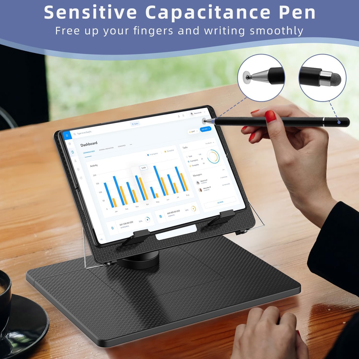 ADJUSTABLE 360° ROTATING STAND: With a 360-degree rotating base(Comes with a tool to adjust the steering shaft tightness), the folding stand holder allows you to adjust the direction and angle for comfortable reading, drawing, writing, and sharing. The stand is made of premium acrylic material and is equipped with protective rubber pads to prevent scratches