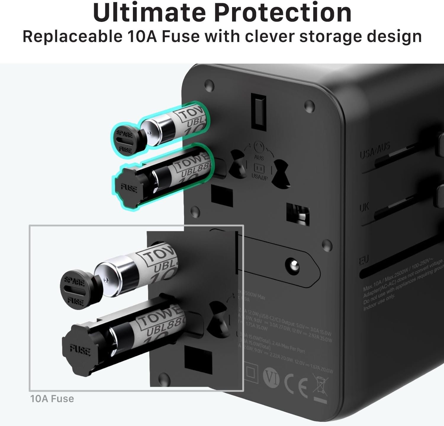 【DOUBLE FUSE + MULTI-LAYER SAFETY PROTECTION】Engineered for safety and reliability, this international adapter is made from fireproof PC material and includes short-circuit protection, over-voltage protection, and surge protection. It also features a child-proof safety shutter, a replaceable 10A fuse with a backup, and an LED status indicator. Certified by CE, FCC, and RoHS, ensuring peace of mind while traveling.