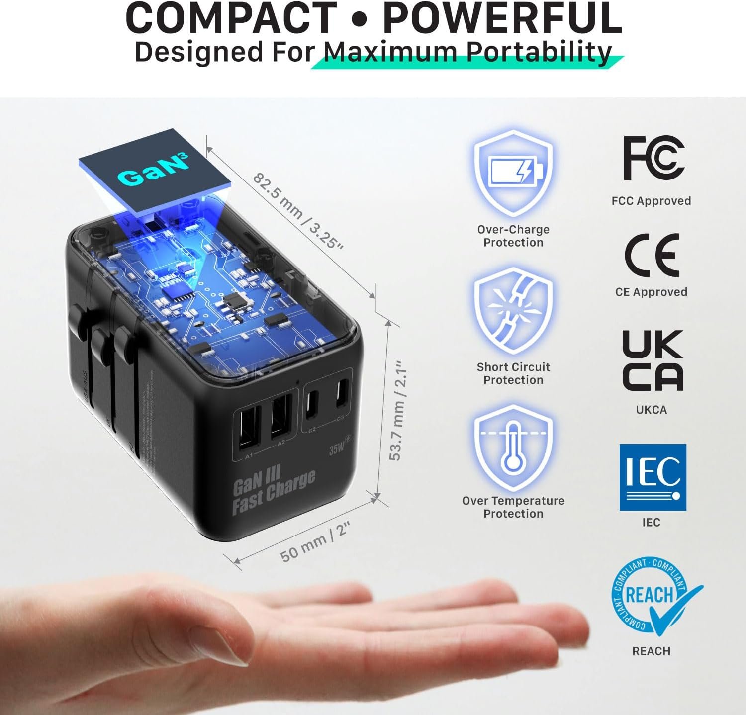 【ADVANCED GaN III TECHNOLOGY】Powered by cutting-edge GaN III technology, this travel plug adapter delivers efficient power management in a remarkably compact design (3.33″ x 1.97″ x 2.11 “) and a lightweight build (6.9 oz). This travel adapter is NOT a voltage converter. Devices like hair dryers, straighteners, and curling irons must support dual voltage to be used with this adapter. Check your device’s voltage compatibility before use.