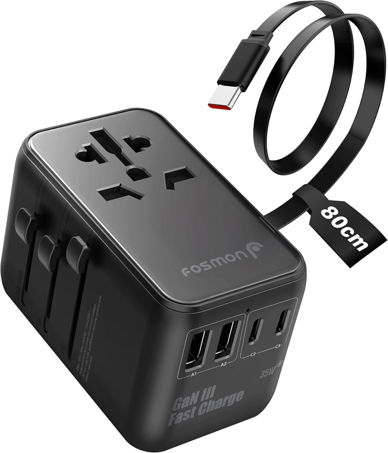 Fosmon Universal Travel Adapter Worldwide with Built-in USB C Cable, 35W GaN III/PD Fast Charging International Travel Plug Adapter, 6 in 1 Power Charger Outlet with 4 USB Ports for US to EU UK AUS