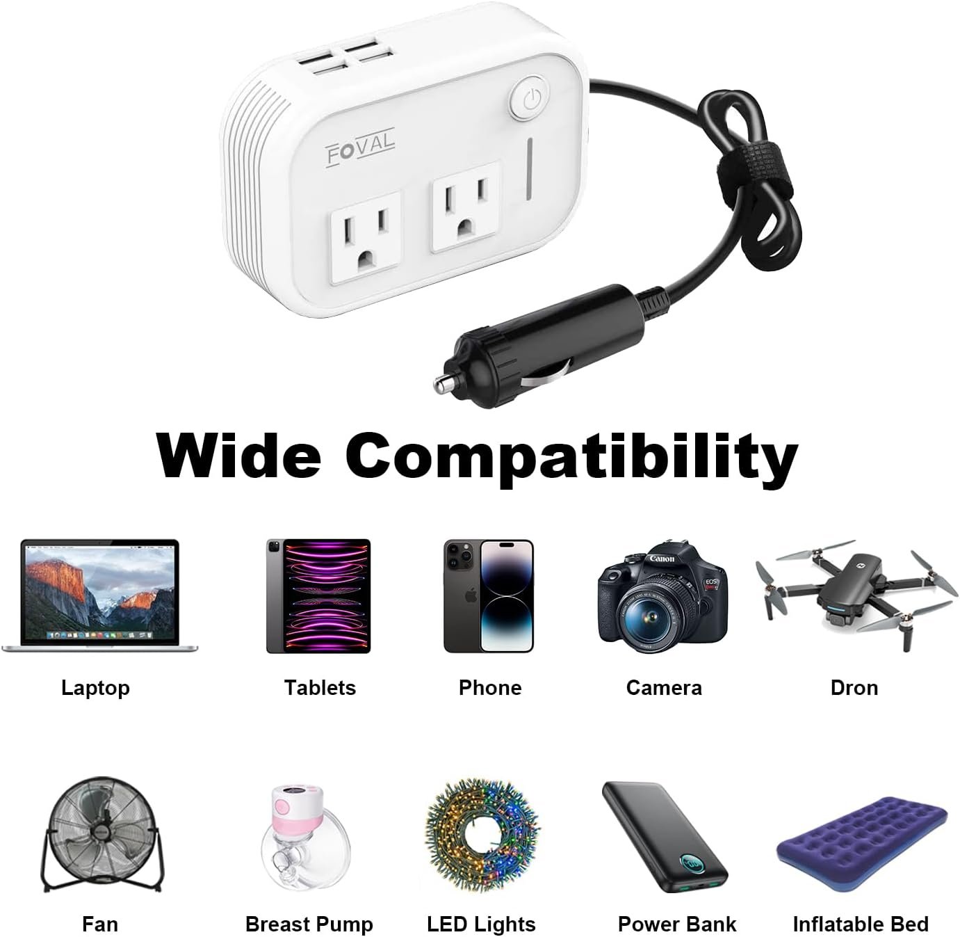 FOVAL power inverters safely charging your Phone, Ipad, MacBook, Laptop, Breast Pump, Cpap Machine, Xbox, Switch, Mspeakers, Camera, Nebulizer, Game Console, Kindle etc,.