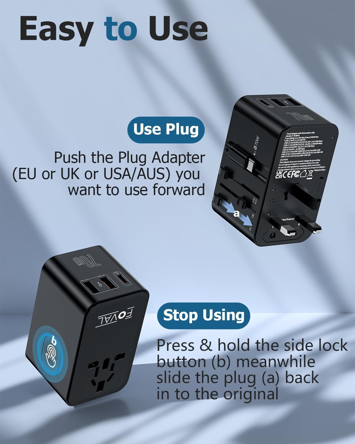FOVAL European Travel Plug Adapter, Universal Travel Adapter with Retractable USB C Cable, All-in-one International Power Adapter for Europe Italy UK US AUS (70W)