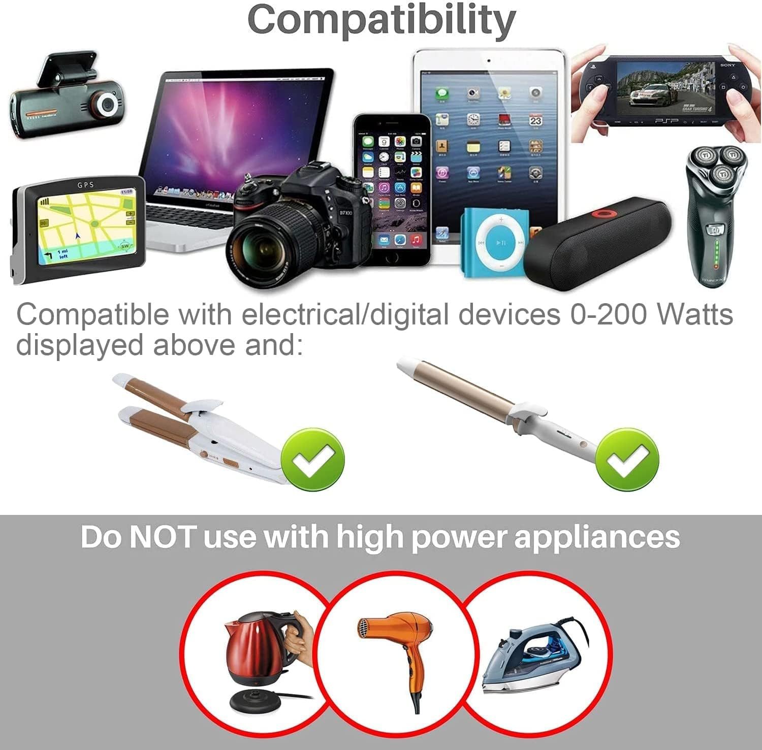 Safe to Use: Certified by CE, FCC and RoHS industry standard. Do Not Use with Hair Dryers and Household Appliance over 230 watt!