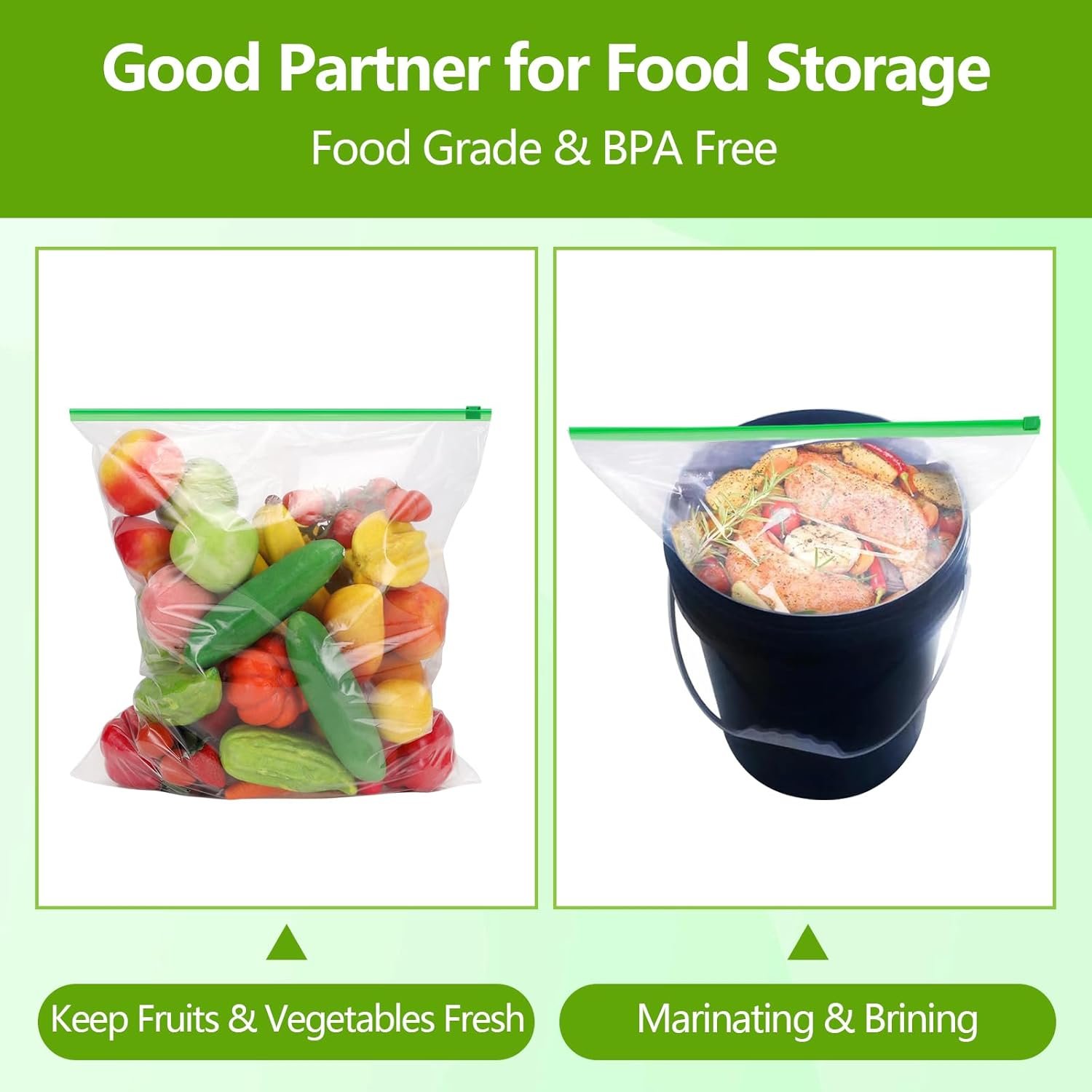 High Quality 3.5 Gallon Slider Storage Bags:Made of high quality BPA-free LDPE, safe to use as freezer bags to store food. 16″ x 18″ bags with 2 Mil thickeness, slider sealing closure, more easier to seal than normal ziplock bags with zipper top