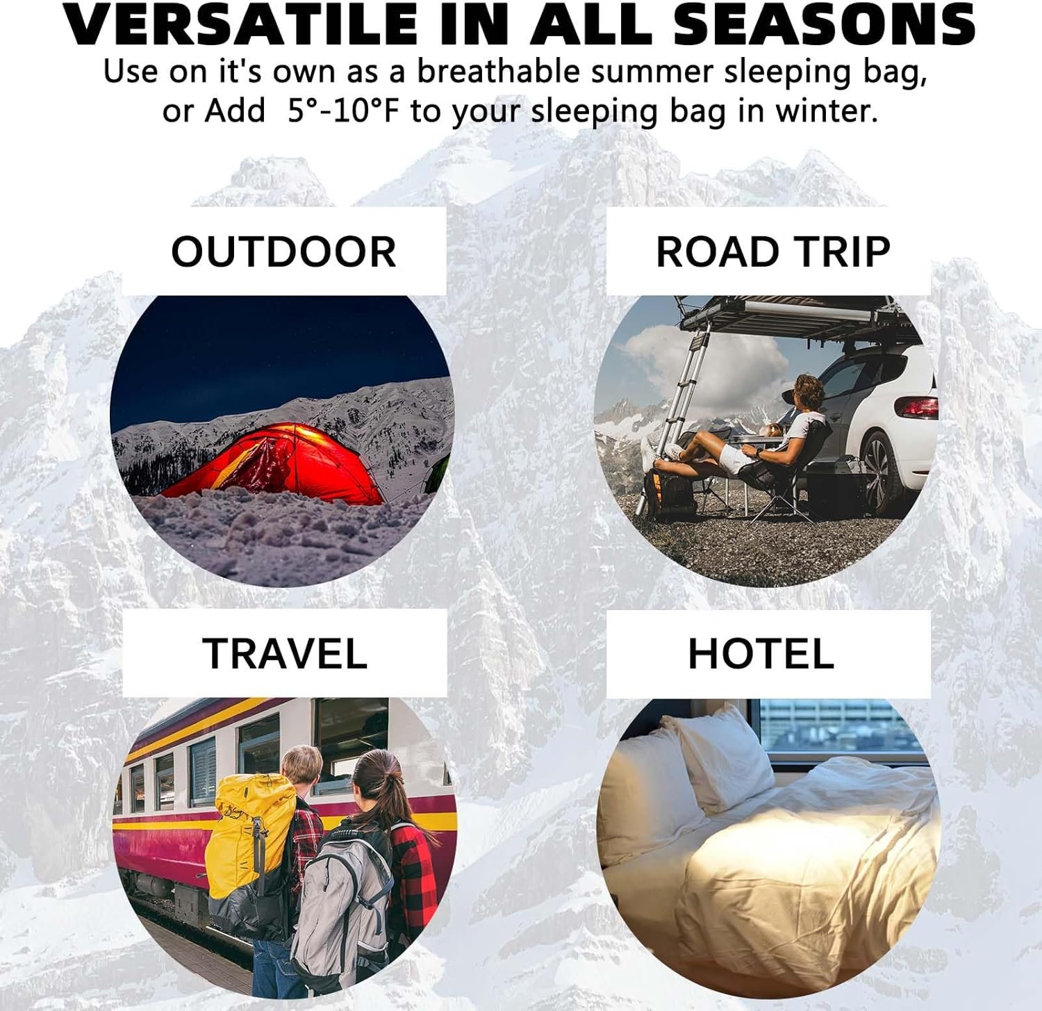 Versatile Use: Our sleeping bag liner is the perfect addition to your outdoor sleep system or serves as a warm-weather ultralight sleeping bag. It’s also the ideal companion for various scenarios. Whether you’re staying in a hostel, enduring long bus rides, or embarking on plane journeys, this liner adds extra warmth and acts as a protective barrier.
