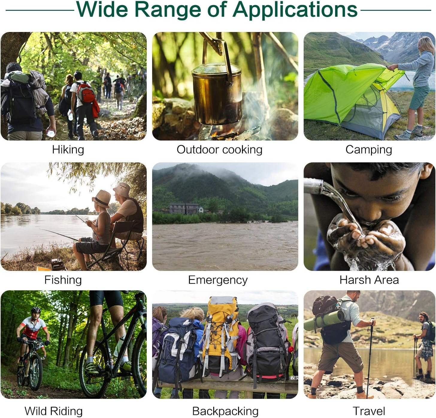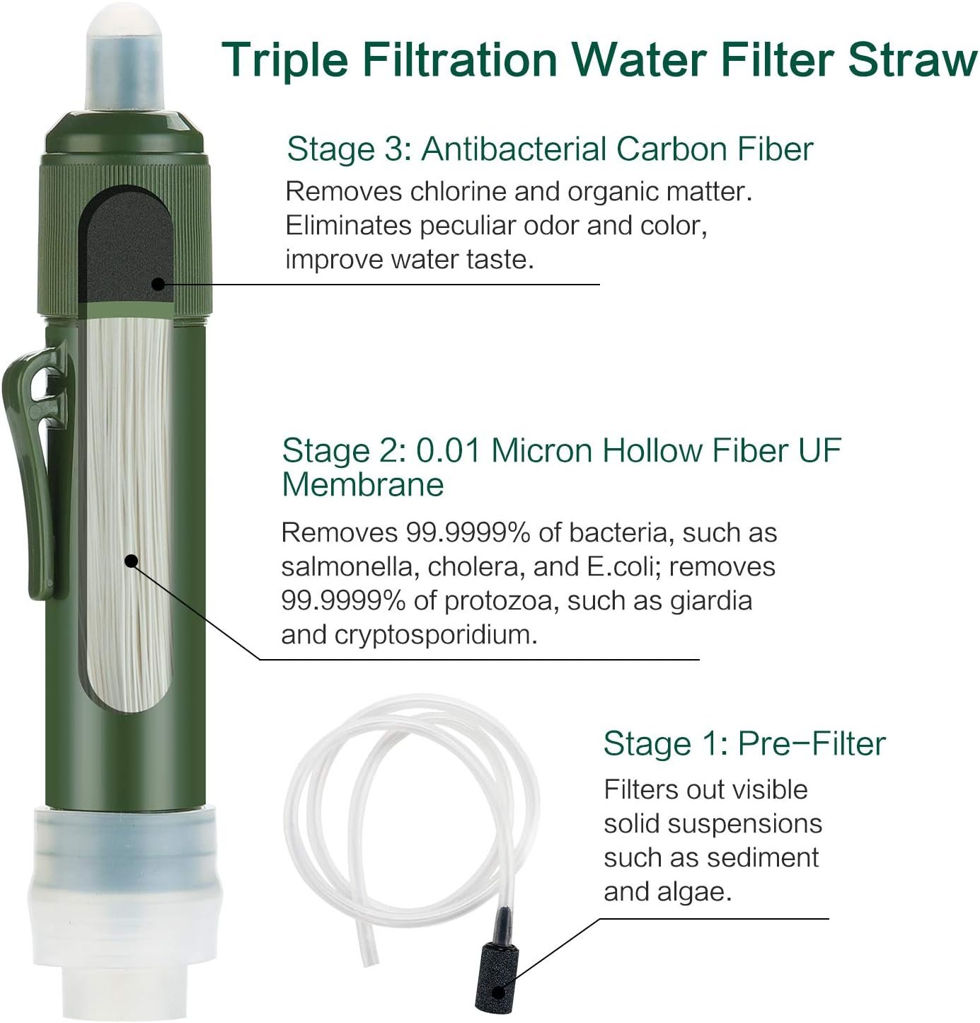 Triple filtration -Combination of Sediment Prefilter ,0.01 Micron membrane filter straw ,Activated carbon Fiber;Remove all visible solid sediments,reduce 99.99999% of harmful substances, and improve the odor, ensuring the safest water in the worst environments.