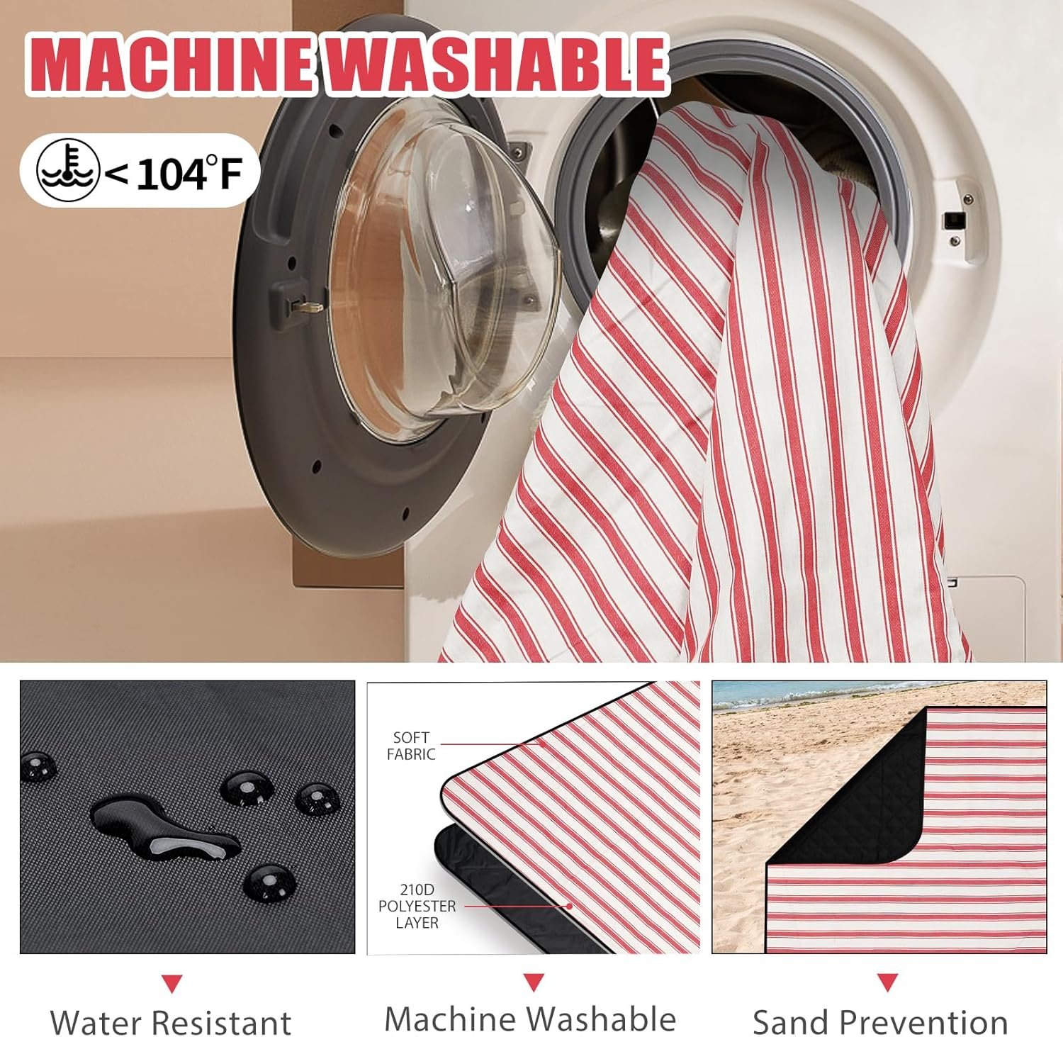 Machine Washable & Easy to Clean – Adopting heavy duty canvas, cycle machine washing does not run cotton, machine washable below 104℉/40℃,compare with other HAND WASH OR SPOT CLEAN picnic blanket, it’s cleaner and saves much of your time, and. It is easy to shake off sand from a beach blanket