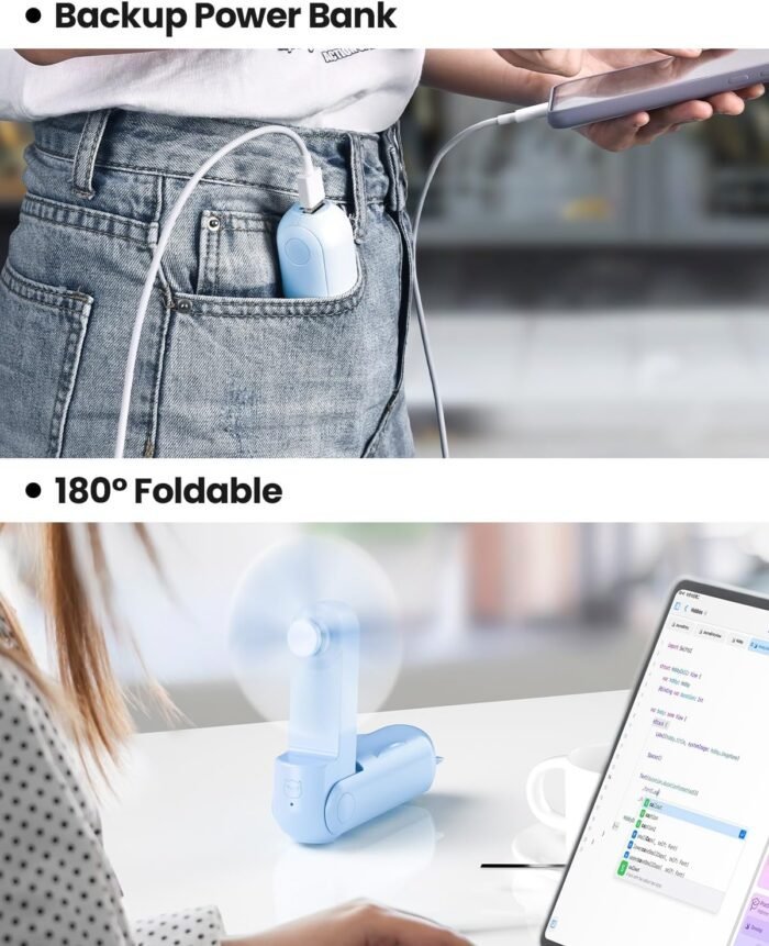 Foldable Handheld and Desk Fan: The mini portable fan is super compact, lightweight and portable; Folding size: 4.47*1.41*1.45in, Weigh: 4.2 oz; It’s a handheld fan when it is unfolded 180°, and a desktop fan when it is unfolded 90 or 270°